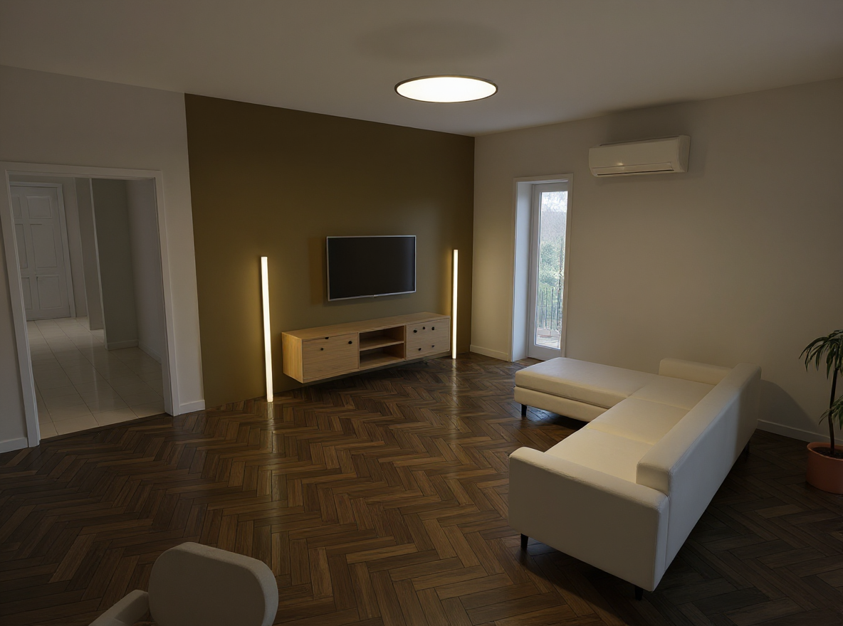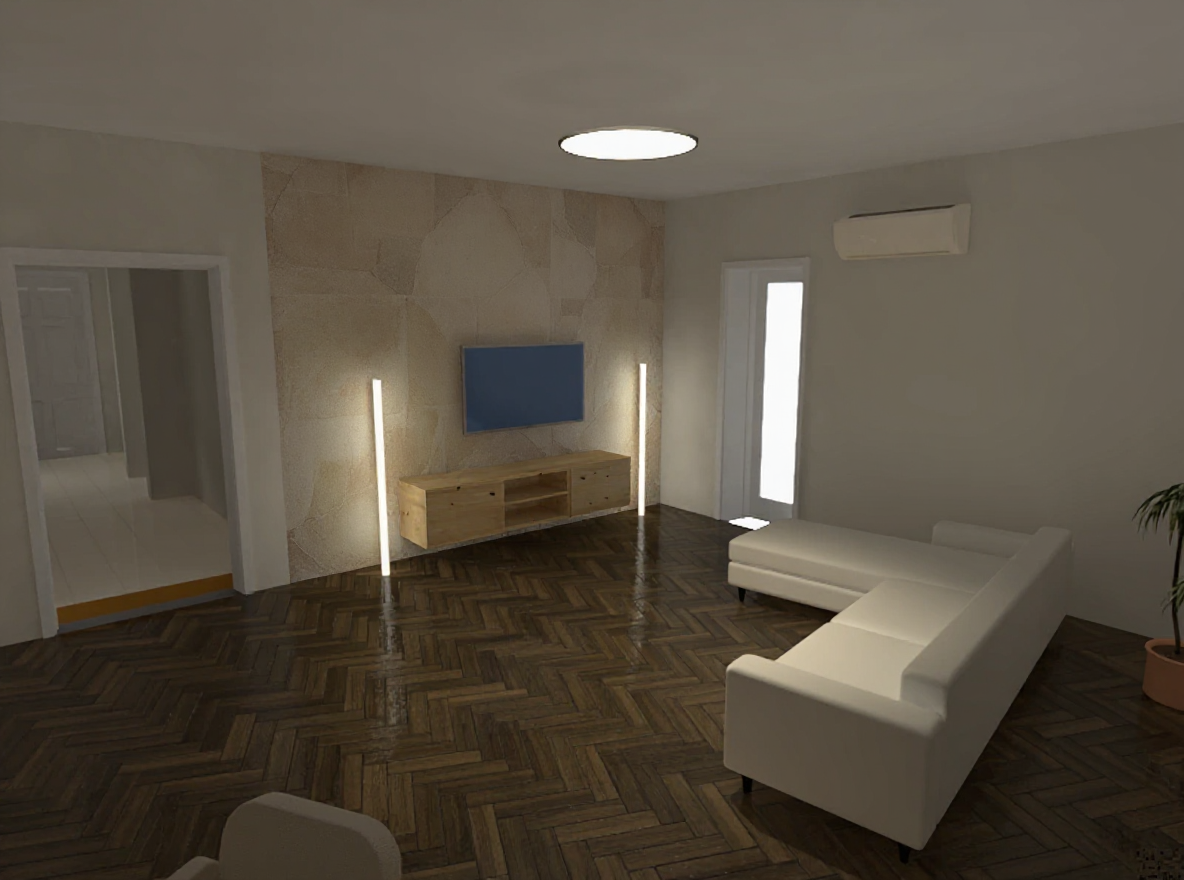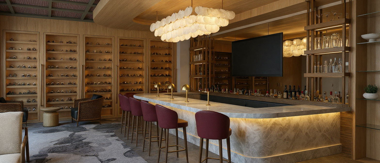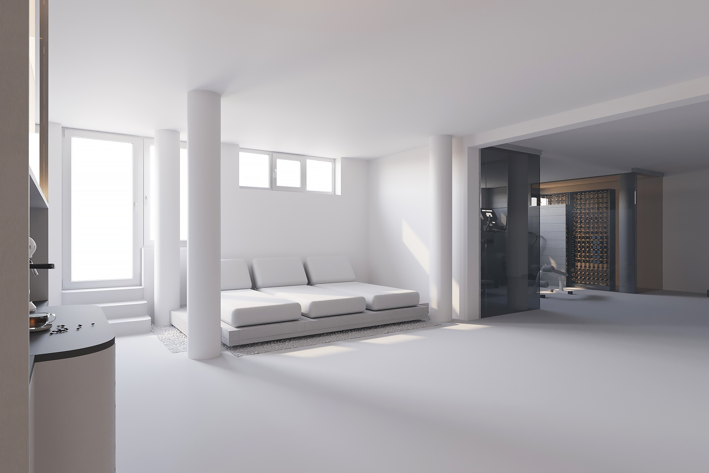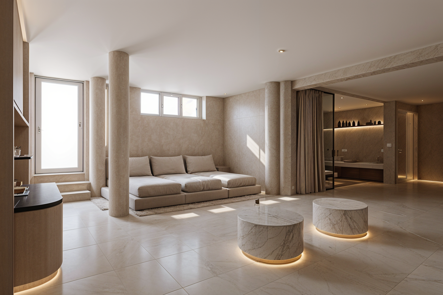 modern interior lounge area sauna wine cellar in the back spa wellness vibe maintain room as it is all walls and floors in large slabs of light color travertine stone in modern design and matt round colums in travertine small square mosaic hidden lights bellow each step curtains on the sides of the round colums