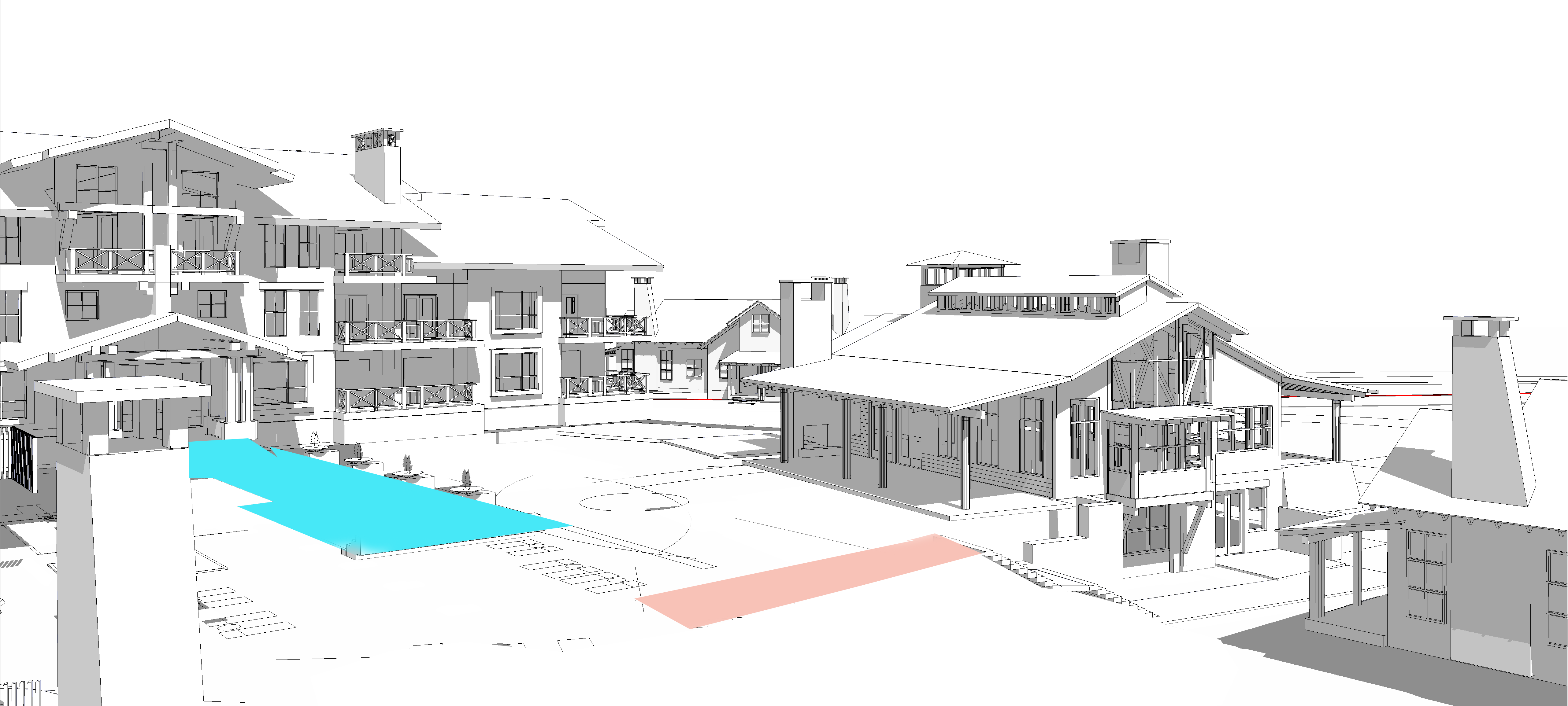 mountain resort with a linear outdoor pool stone and wood clad architecture