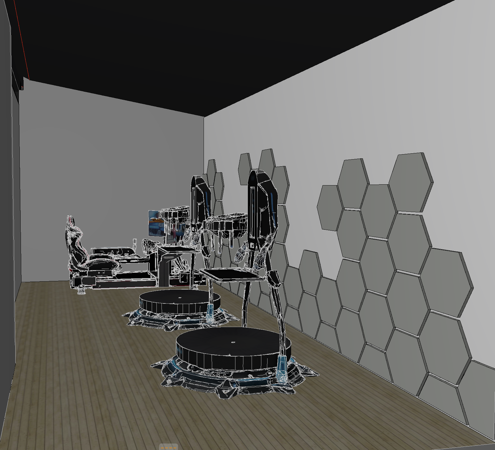 transform this internal view into a realistic render the image shows a gaming room with feature hexagon side panelling with back lighting