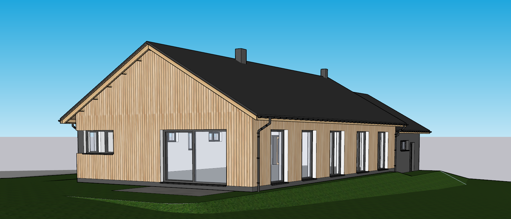 a modern house with a dark metal roof and vertical wooden siding for the walls the garage and supporting structures are finished with dark plaster all windows and the main door are dark colored complementing the sleek aesthetic curtains are visible behind the windows adding a lived in feel the house sits on a gently sloped grassy terrain surrounding the house are low bushes and flower beds neatly landscaped the chimneys are covered in matching dark sheet metal blending seamlessly with the roof the scene is well lit under a clear blue sky