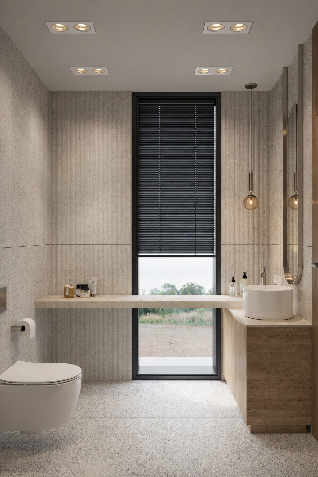 render a modern bathroom with a minimalist and serene atmosphere the walls and floor should be in a soft textured light gray to create a calm and inviting space include a sleek wall mounted white toilet to the left above the ceiling has recessed lighting with warm golden glows adding soft illumination to the right a smooth wood vanity in a natural oak finish supports a round white ceramic sink above the sink hang an elegant frameless oval mirror add two pendant lights with warm amber bulbs casting a gentle glow a large window should have black blinds partially open to reveal a view of a tranquil garden with lush greenery allowing natural light to pour in ensure the room feels airy and bright with subtle shadows adding depth