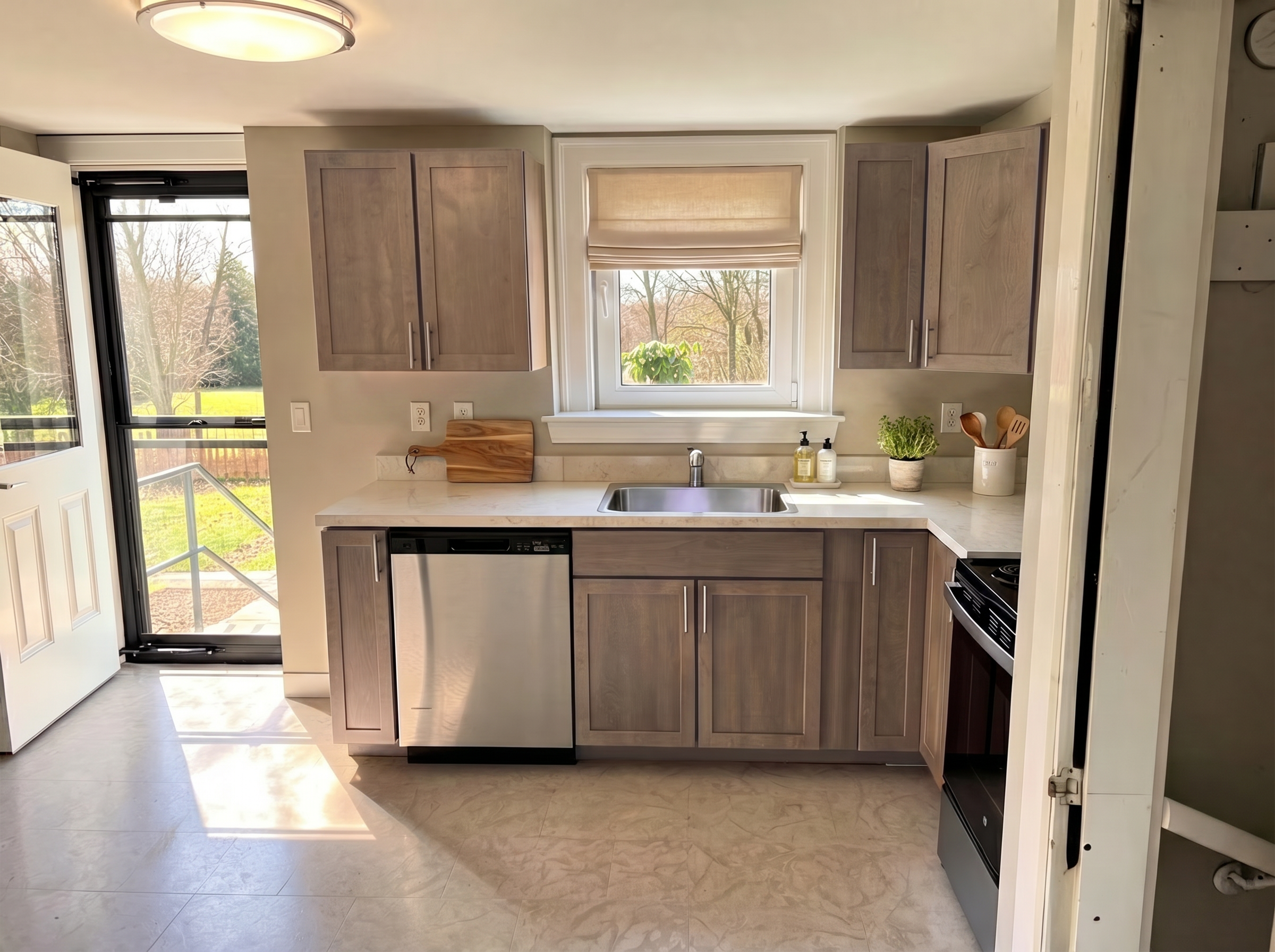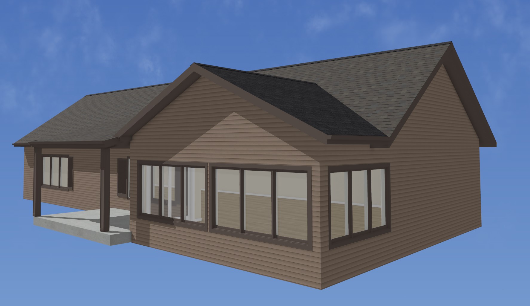 make this image a photo light landscaping this is an image of a backyard of a home with a new roof over a patio the roof is driftwood the siding is a grey brown lap siding the windows are a dark bronze color the shutters are dark bronze panels