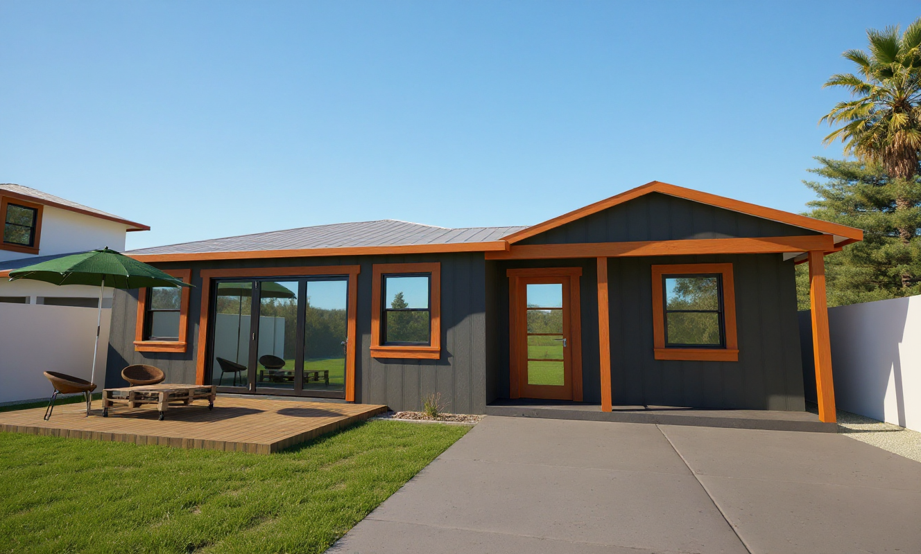 scandinavian style bungalow with cedar wood window and door trims vertical board and batten black wood walls curtains closed inside sliding glass door on a sunny california weather and native california landscape and trees in the background bermuda grass at front and bushes wood fences on left and side with bushes