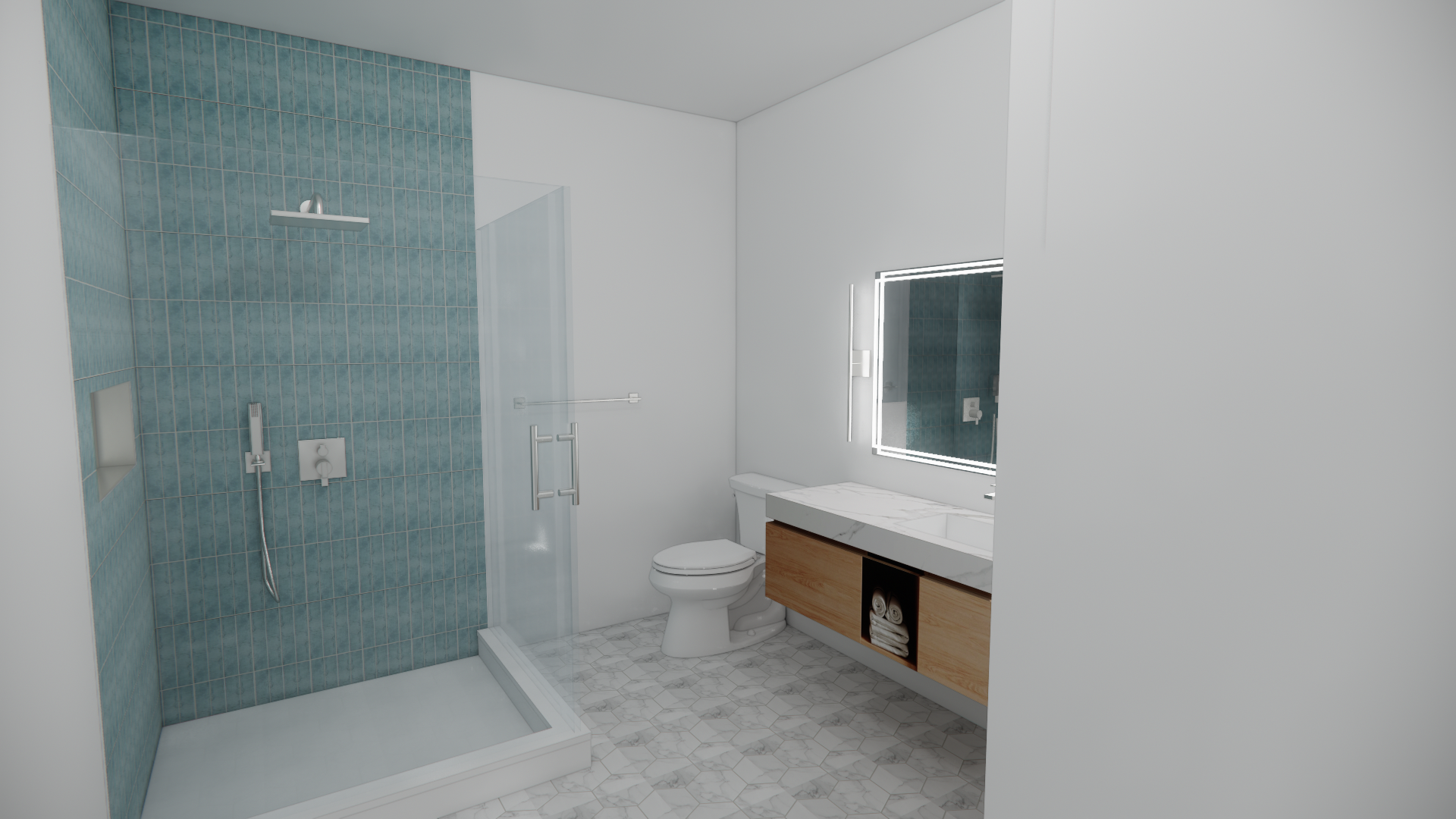 make this look photo realistic keep the floor scale the same hexagons in as calcutta marble make look realistic and make lighting coming in from behind view day light realistic
