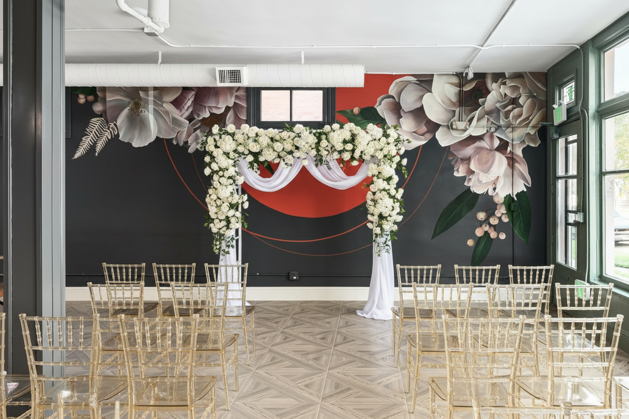 create a wedding venue scene in this room with an circular arch decorated unevenly like the reference photo in white blush and pink flowers to match the wall art remove the chairs
