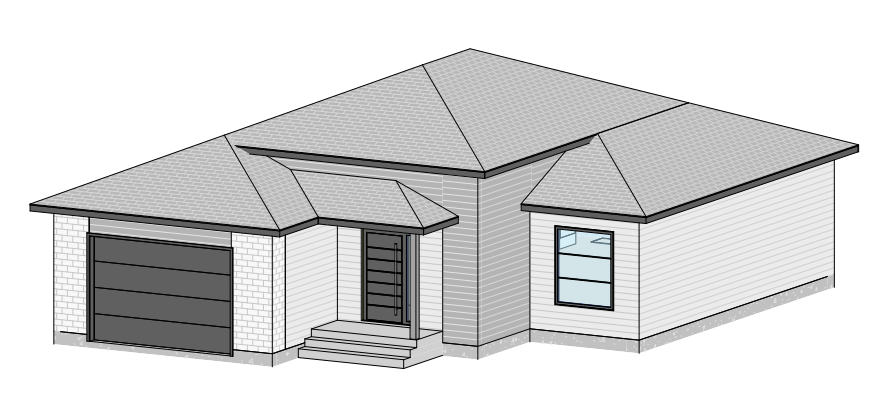 create a realistic rendering of a modern single story house with a sleek and minimalistic design the roof is dark gray shingles the walls are a soft grey horizontal siding with another tone of vertical black siding providing contrast the garage wall is grey brick the door and main entrance are a black offering a modern aesthetic the window features clear glass with a slight reflection framed with the same black as the doors the atmosphere is serene and inviting with natural daylight casting soft shadows enhancing the architectural details surround the house with lush green grass for a fresh and vibrant appearance