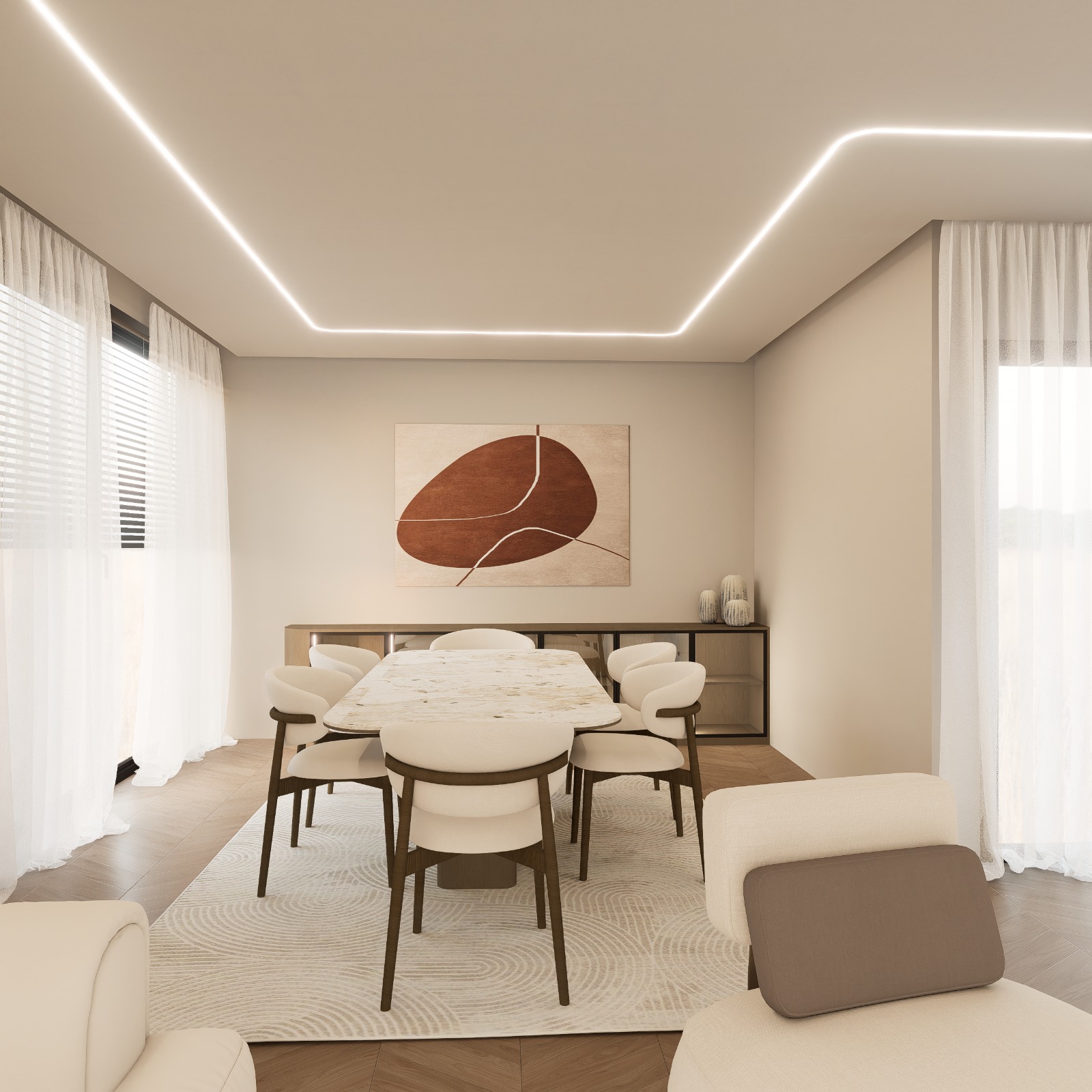 ultra realistic luxury modern dining room render preserve exact layout furniture positions proportions materials and camera angle do not change design upgrade to high end pinterest architectural magazine quality materials make everything feel expensive dining table natural stone light marble travertine detailed veining subtle translucency realistic gloss variation micro imperfections chairs premium fabric upholstery soft boucl or fine textile visible weave natural wrinkles slight compression wood elements legs console warm walnut tone rich grain variation matte satin finish floor herringbone wood parquet refined texture subtle reflectivity walls ceiling smooth plaster with very subtle imperfections no flat cg look lighting key for luxury feel natural daylight from left window soft directional realistic intensity soft shadows across table chairs and rug ceiling led strip continuous warm indirect light diffused no harsh glow or clipping balanced contrast like professional interior photography realism details non negotiable add micro imperfections roughness variation slight dust subtle wear beveled edges everywhere no sharp cgi edges realistic reflections on table surface controlled not mirror like ambient occlusion in corners under chairs under table fabric soft elements curtains sheer fabric realistic transparency layered folds natural light diffusion rug high detail fibers soft depth slight irregularities styling keep it premium not cluttered table minimal curated setup 1 2 objects max ceramic vase or small decor console clean composition few sculptural decor pieces wall art keep same but enhance texture and realism camera render keep original framing slight depth of field very subtle high dynamic range balanced exposure sharp but natural no overprocessing final look warm calm ultra luxury dining space editorial pinterest level zero cgi feeling