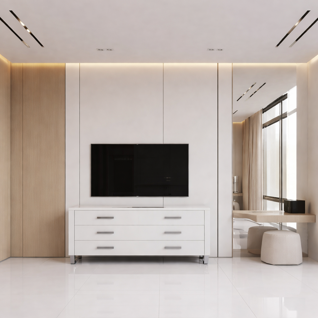 sustituir el panel de madera por un ventanal de techo al suelo con la carpinteria de aluninio blanco sin cortinas