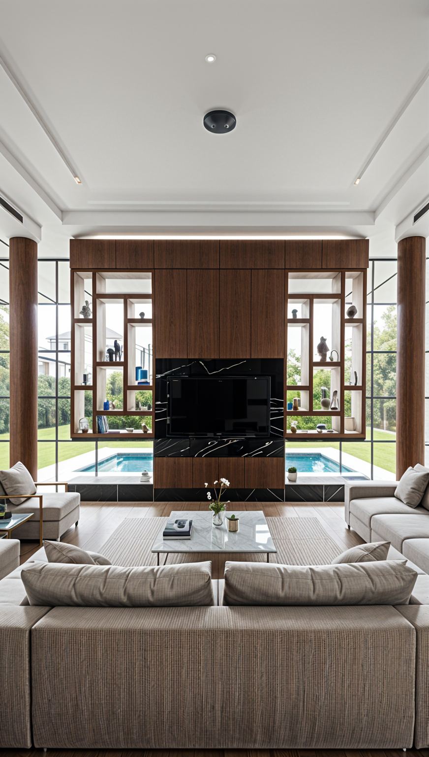 white stucco walls all full brick chimneys blue gray shingle roof blue gray door trim add clouds to brightly lit sky patio and furniture at door add copper gutters fire in fireplace