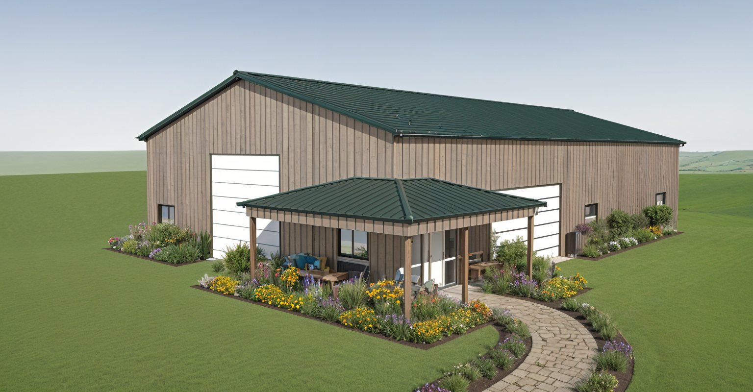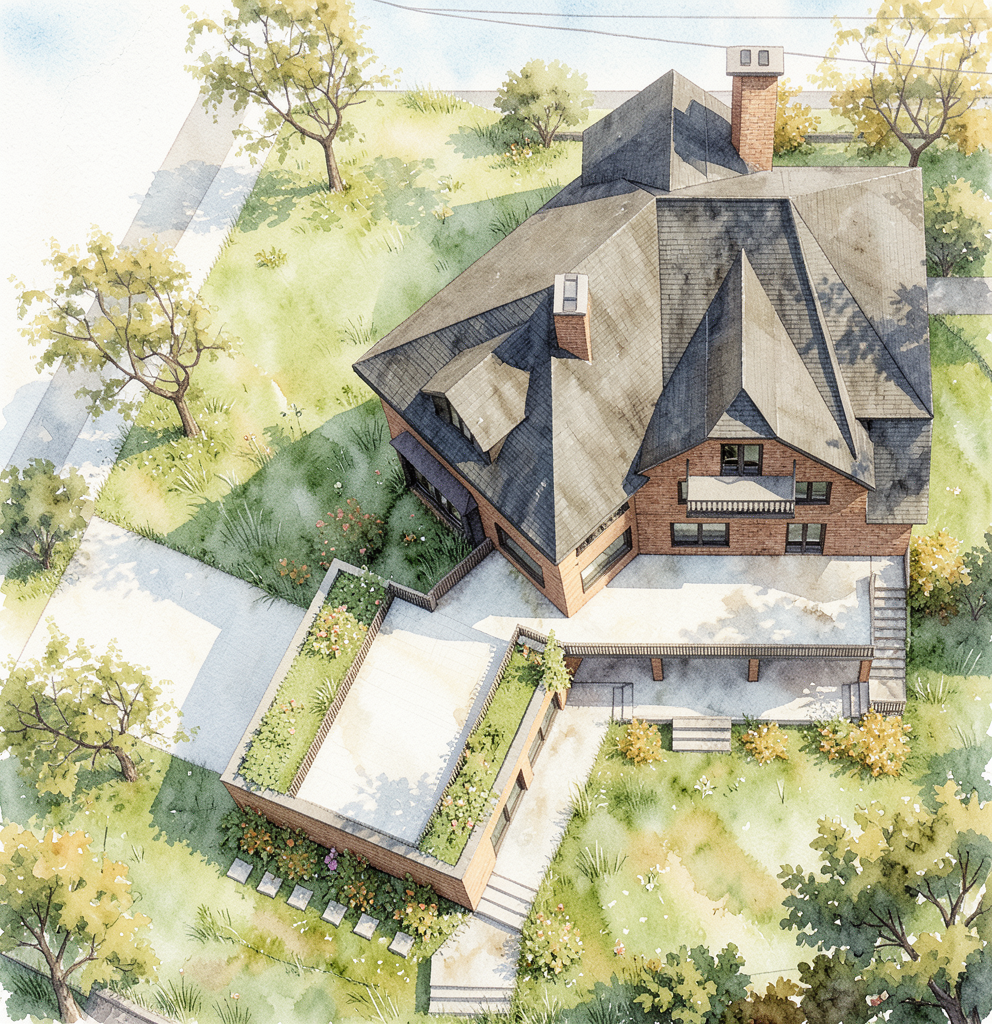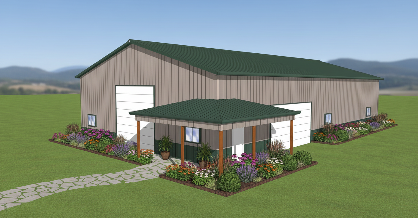 a manicured lawn layered flower beds low maintenance shrubs native plants stone pathway leading to the entrance