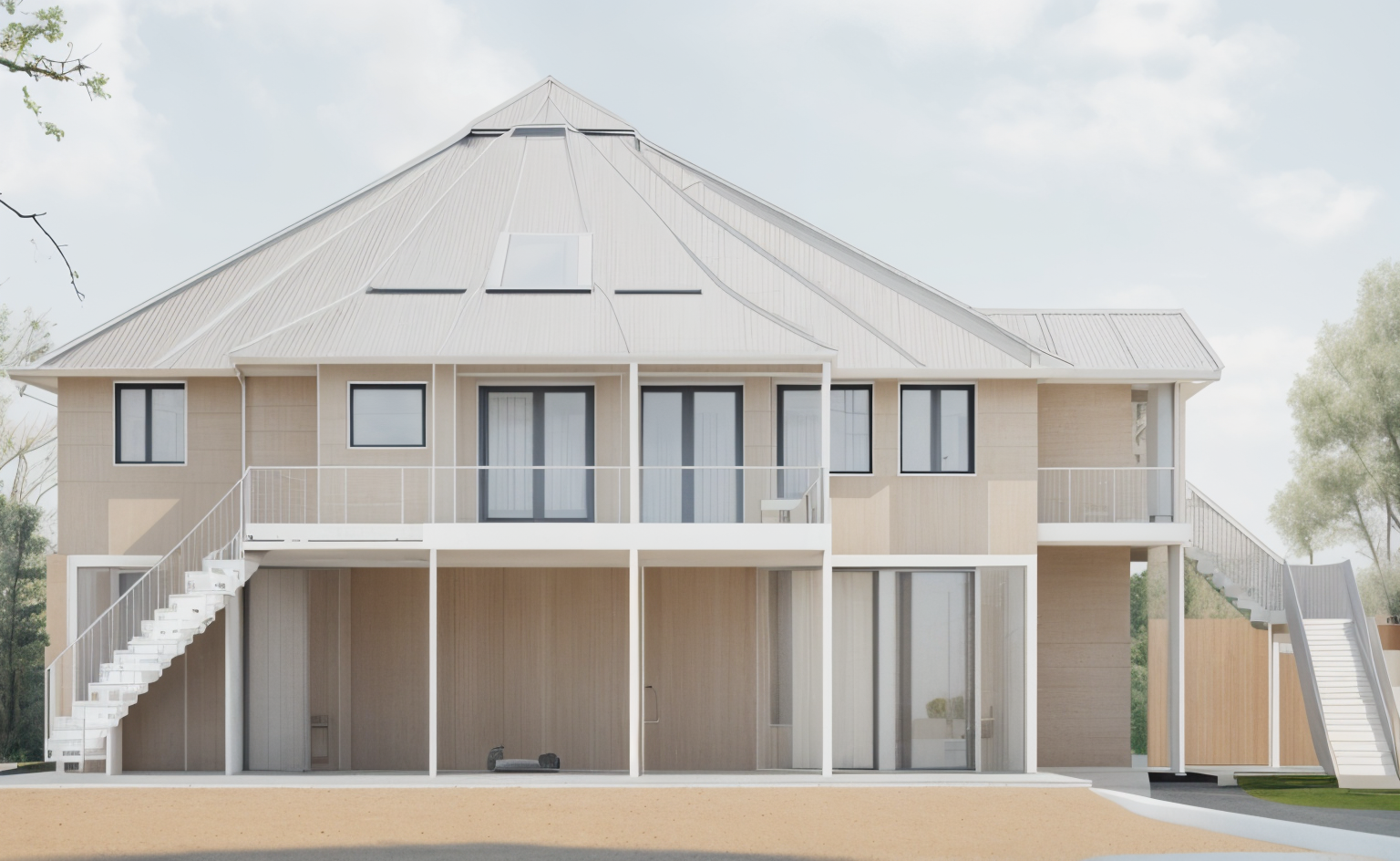 beige house with white siding and a metal roof situated on a cement slab background is a clear blue cloudless florida gulf coast sky at noon