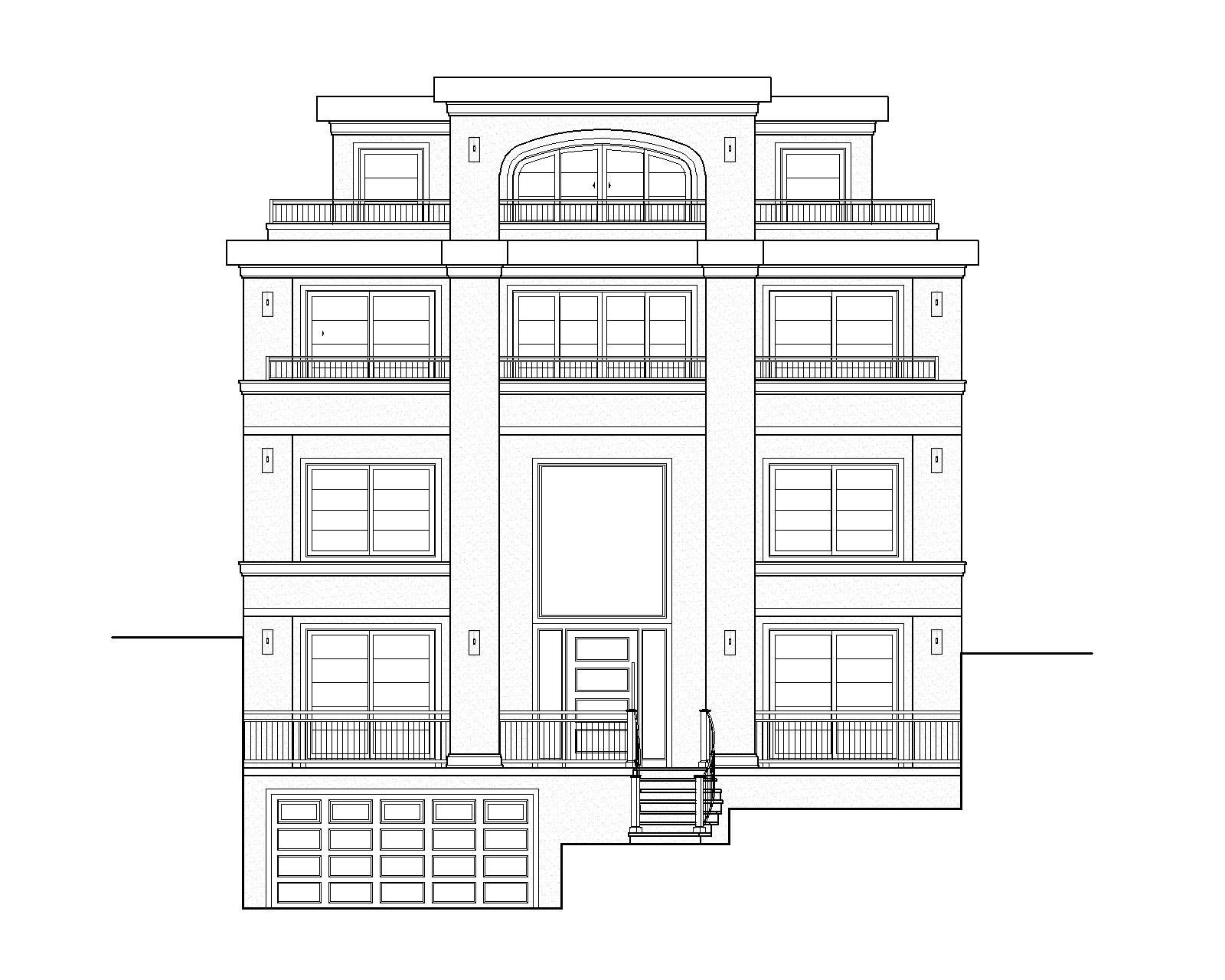 black framed windows contemporary style stucco with modern accents add some mature trees in the background add a walkway to the steps add a driveway to the garage door give the building a modern limestone look add some limestone detail to the building make it early evening with a nice sky only make the windows rail door garage and light fixtures look black keep the building and the roof caps a light color make the roof caps to match the building color do not show any black in the roof caps
