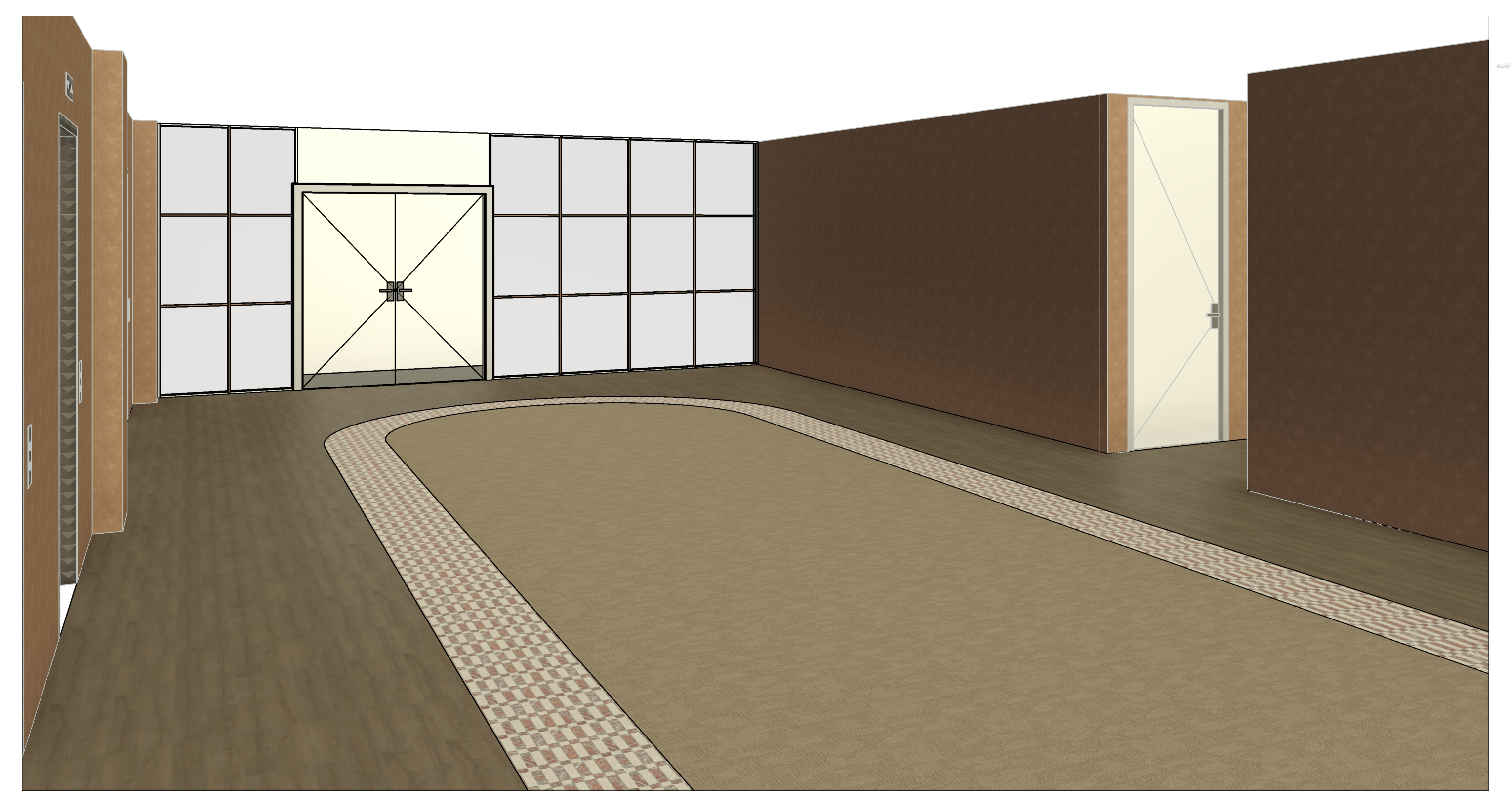 generate a realistic 3d view of a lobby of an office building using the reference materials used the image with the frame of the glass being powder coated beige and the floor being light wood laminate the