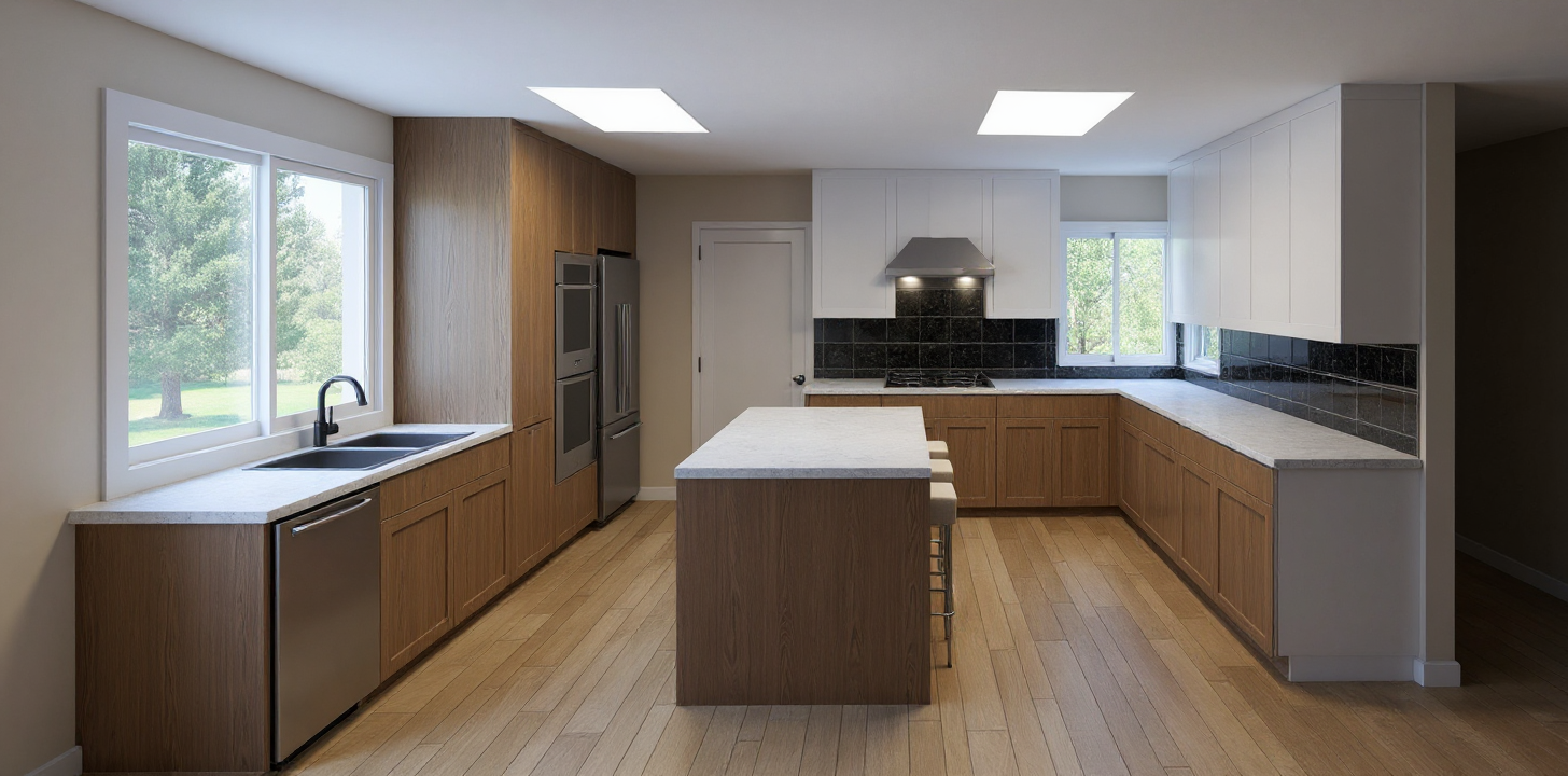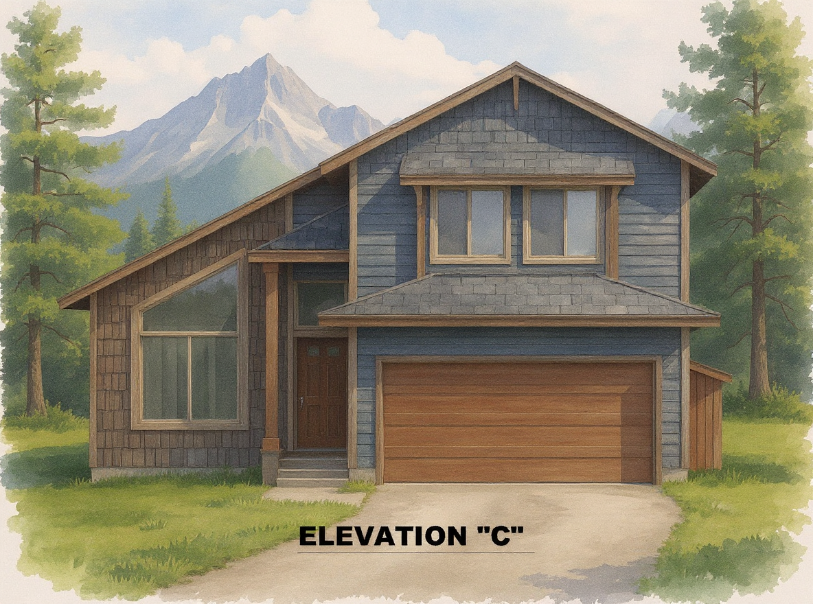 grainy watercolor render of coastal home with blue paint stone accents include trees and mountainous alaska environment in the background simple driveway and walkways in front of the home