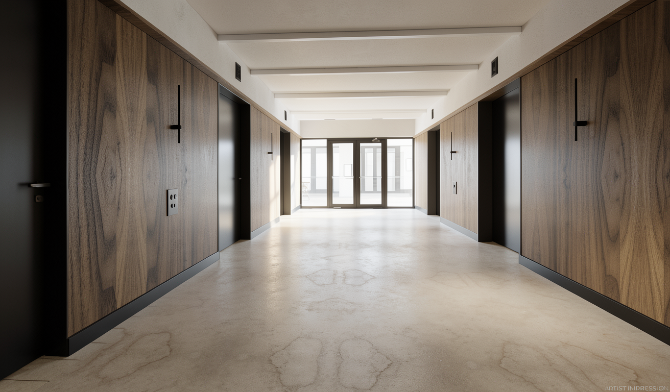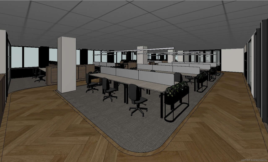 this is an interior render of a commercial workplace interior for a corporate client enhance this base render to a photorealistic level only improve material realism surface texture depth subtle reflections soft shadowing consistent global illumination and minor real world imperfections typical of a completed workplace environment preserve the scene exactly as provided do not alter the camera angle framing layout proportions geometry finishes furniture placement or spatial relationships do not add remove replace redesign or stylise any objects furniture or materials lighting scheme neutral evenly distributed ambient workplace lighting no visible light direction no daylight casting no sun patches glow shafts or highlights suggesting light entering the space lighting should feel understated diffuse and functional similar to real commercial office conditions maintain realistic interior exposure with restrained brightness and soft tonal variation avoid bright whites dramatic contrast or stylised lighting effects do not introduce additional lighting elements or mood maintain the original architectural design intent focusing strictly on realism clarity and accuracy suitable for professional commercial client presentation