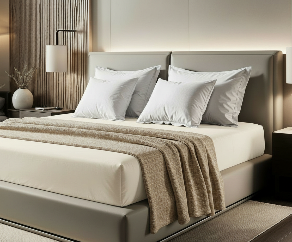 create a realistic image from this kitchen rendering do not change the cabinets or moldings the perimeter cabinets is an ivory color with luce oro quartz countertops change the refrigerator to a standard depth side by side stainless steel fridge change the range and microwave hood to updated appliances the doorway leads to a living room