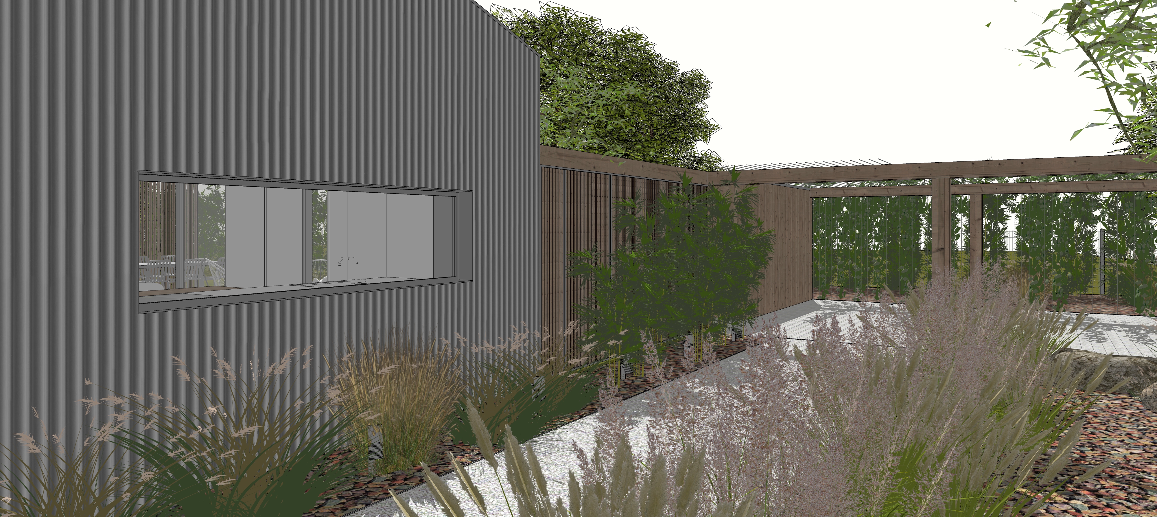 a matte finished light grey corrugated metal fa ade grey painted sliding shutters with a steel frame and timber slats sky with little clouds midday summer wood with little patina gravel path