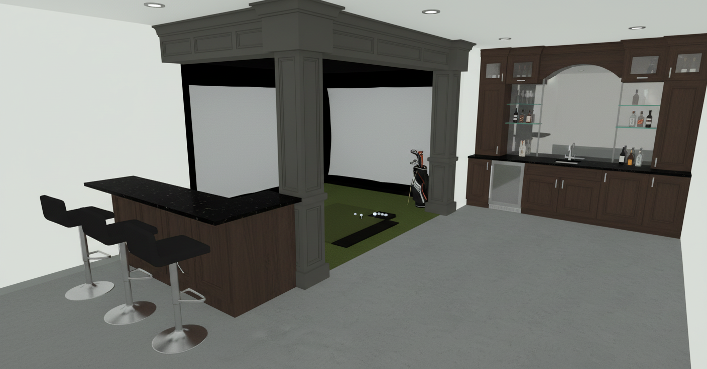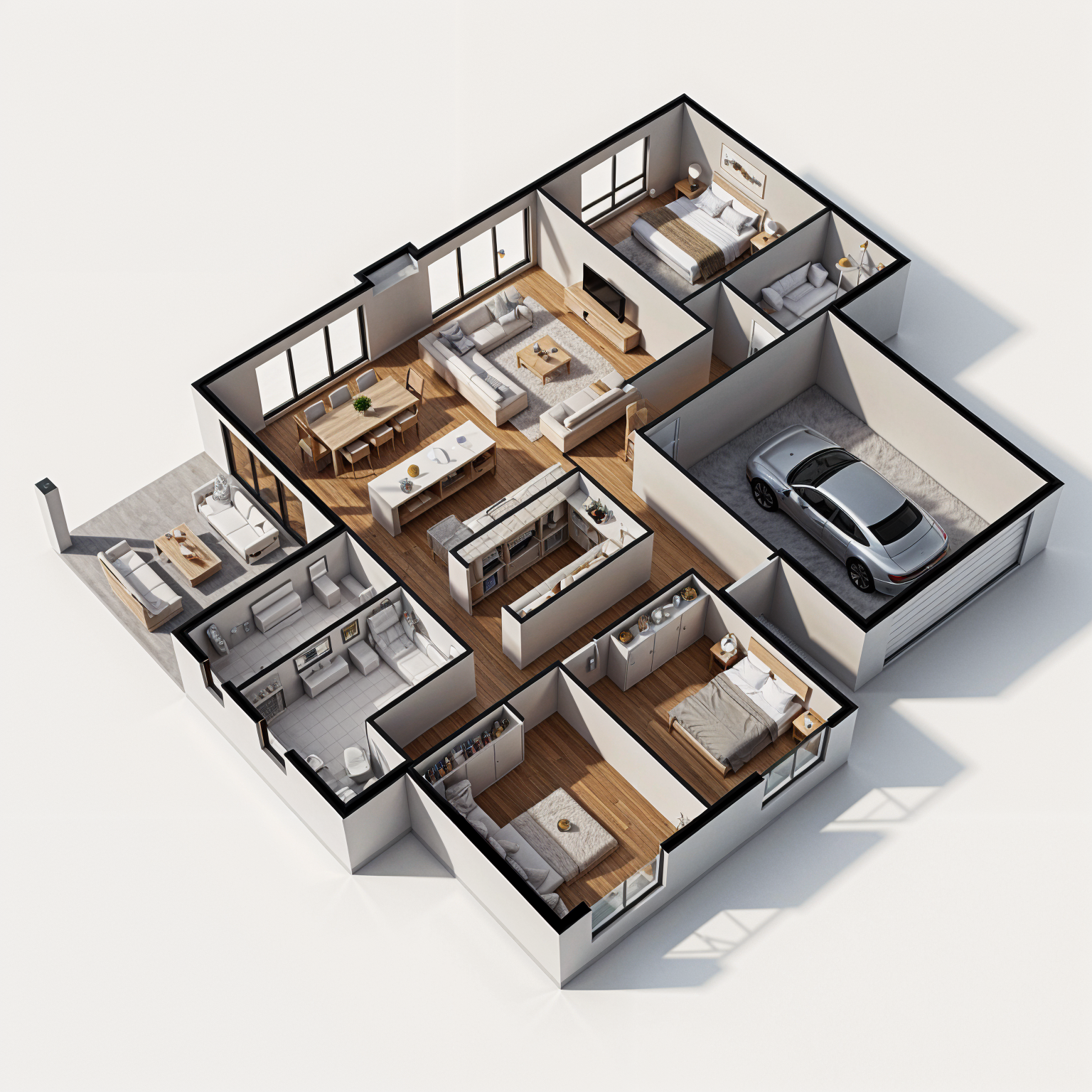 create a photorealistic architectural visualization of the provided scene from an elevated aerial viewpoint preserve all original materials colors lighting fog and the overall atmosphere of the scene exactly as they are enhance the composition by adding realistic trees in the foreground naturally integrated into the scene without altering the original design intent maintain high material accuracy realistic light behavior in fog soft shadows and a professional architectural visualization style do not change the mood weather conditions or environmental atmosphere of the scene