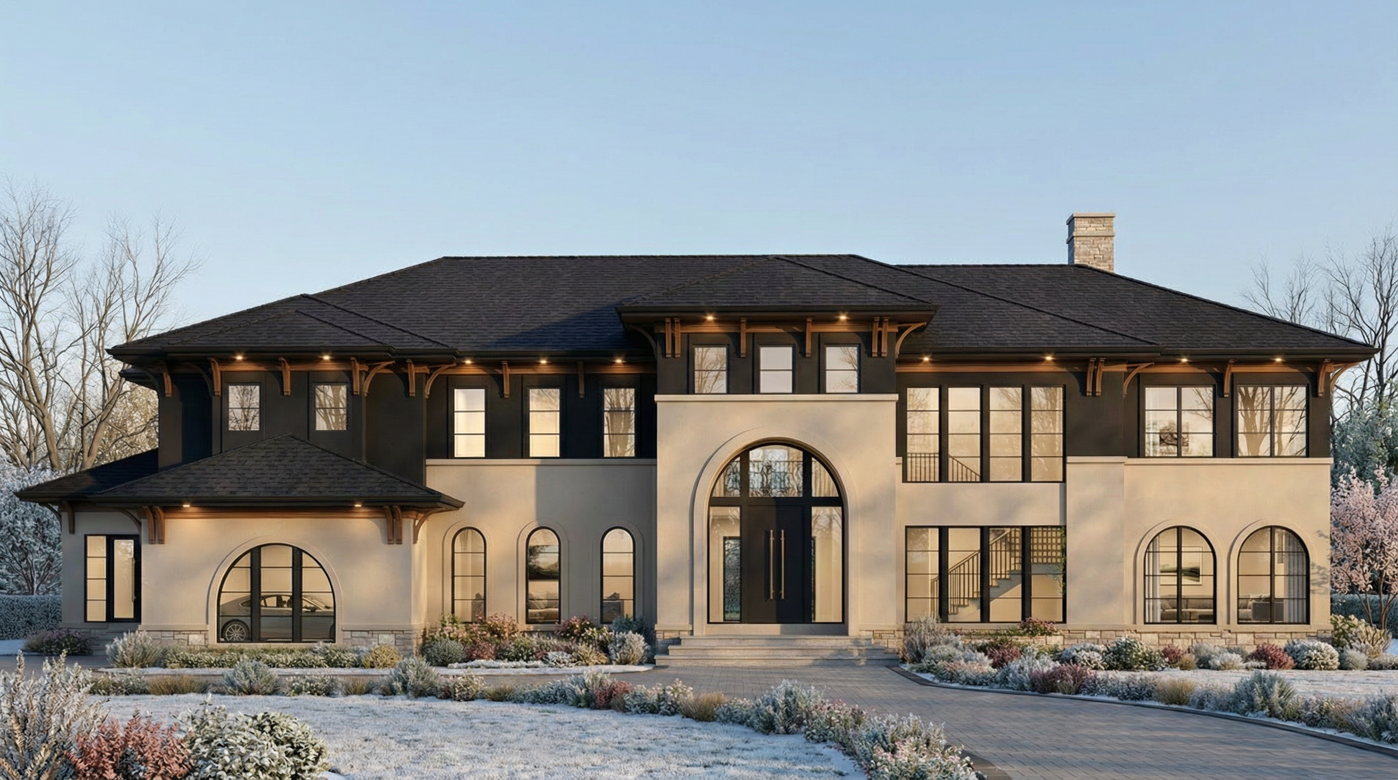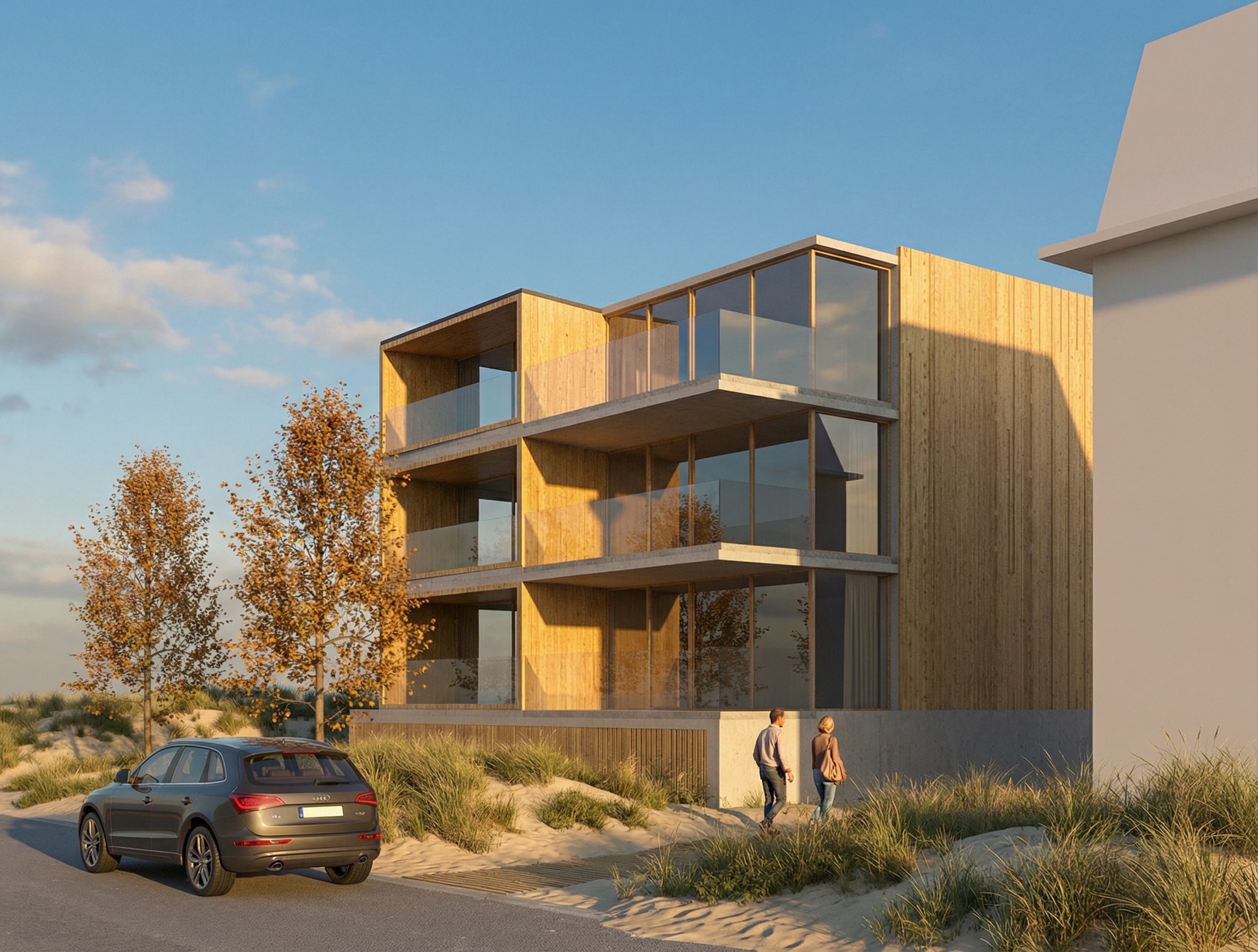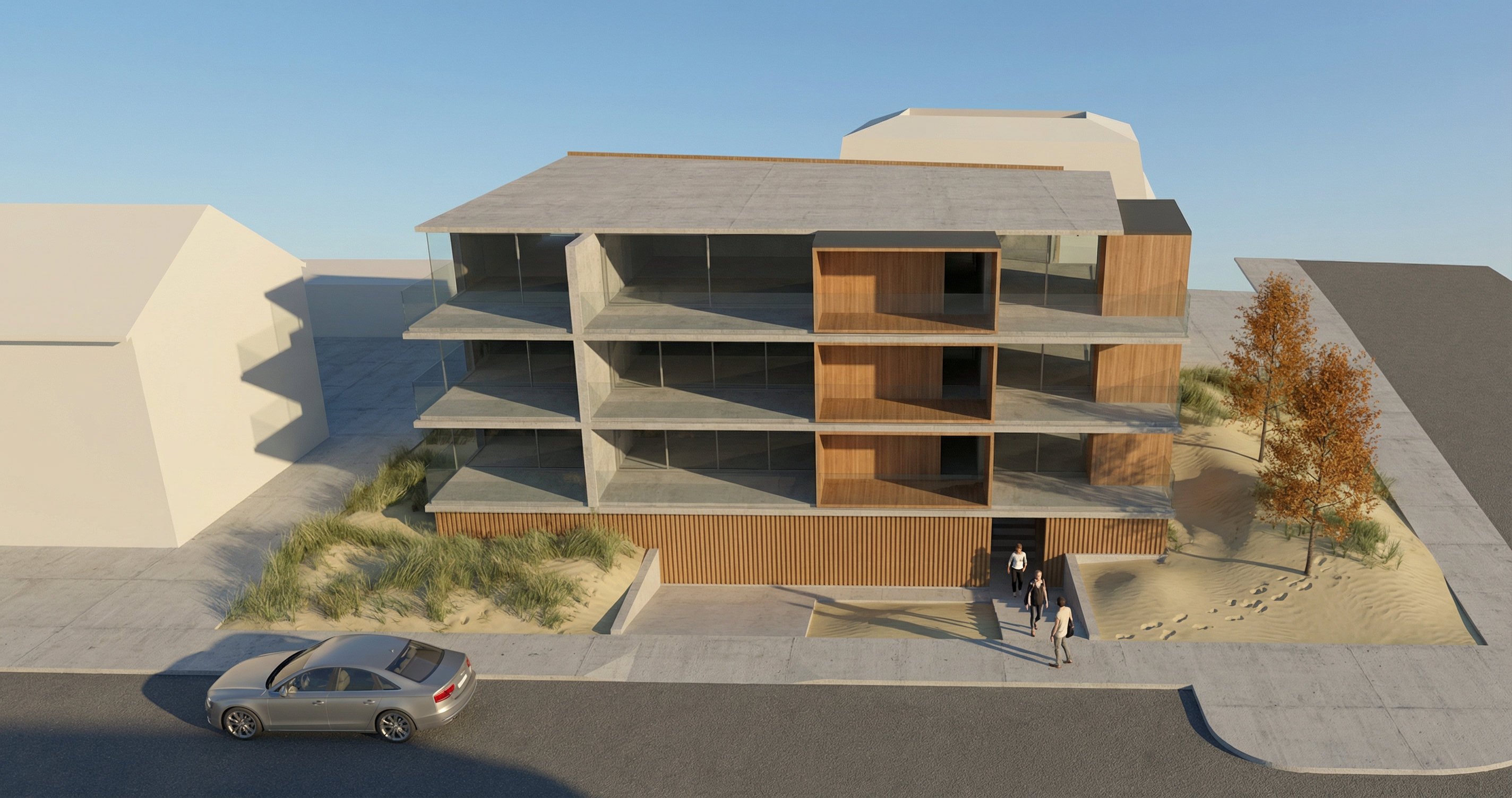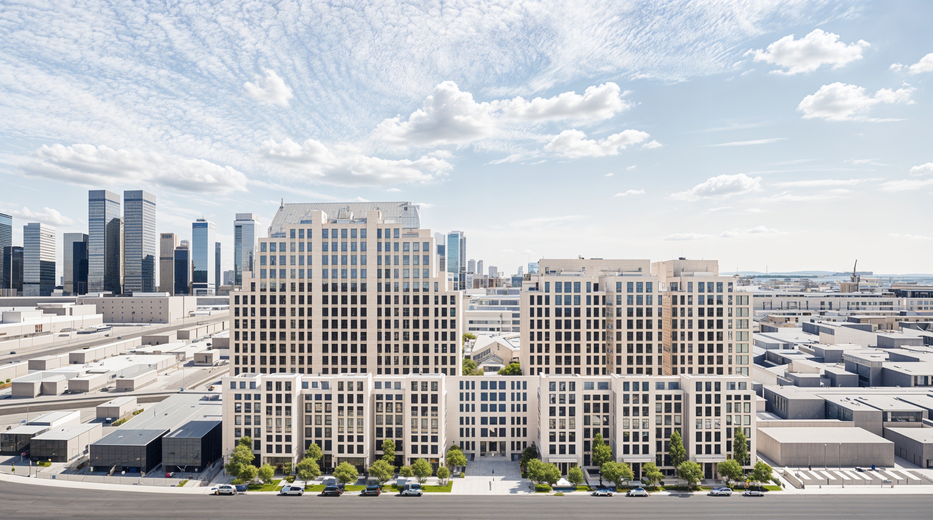 maintain the geometry and apply white limestone on the podium and light wheat brick material on the higher levels