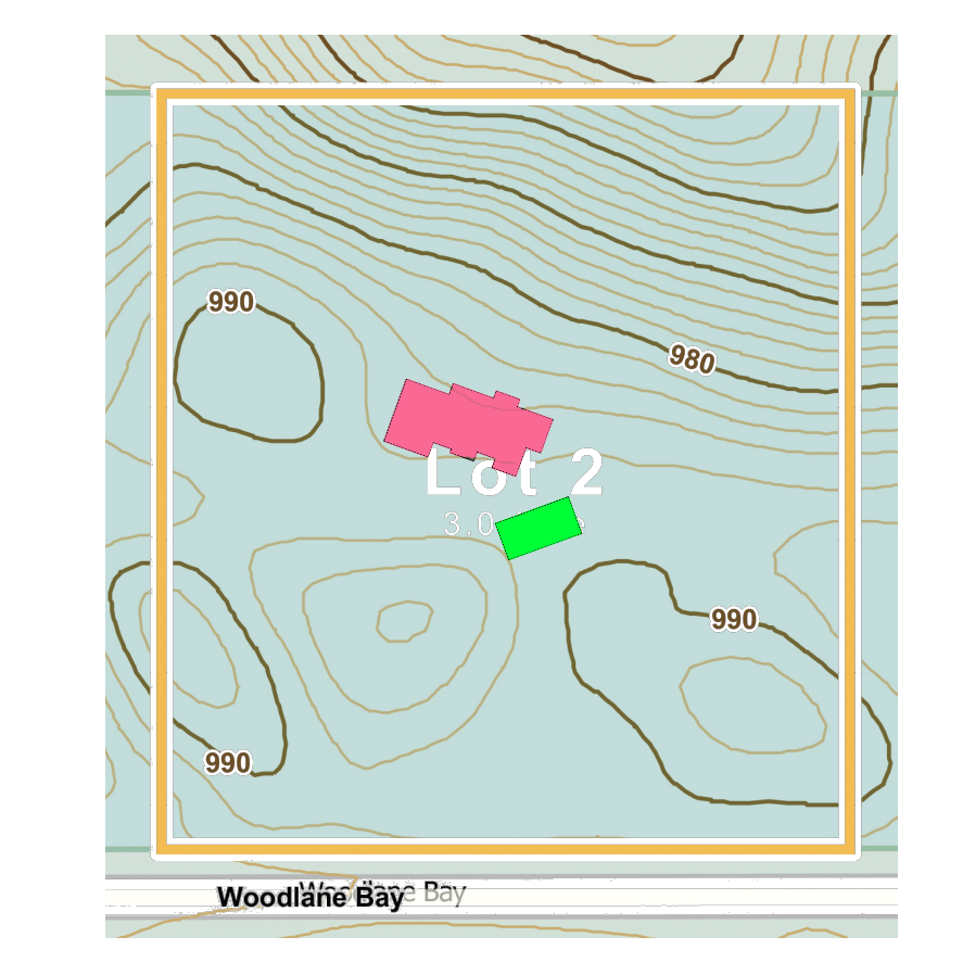 update aerial view of lot with pink as white farmhouse and green as pool location sourdounded by heavy tree coverage at sunset