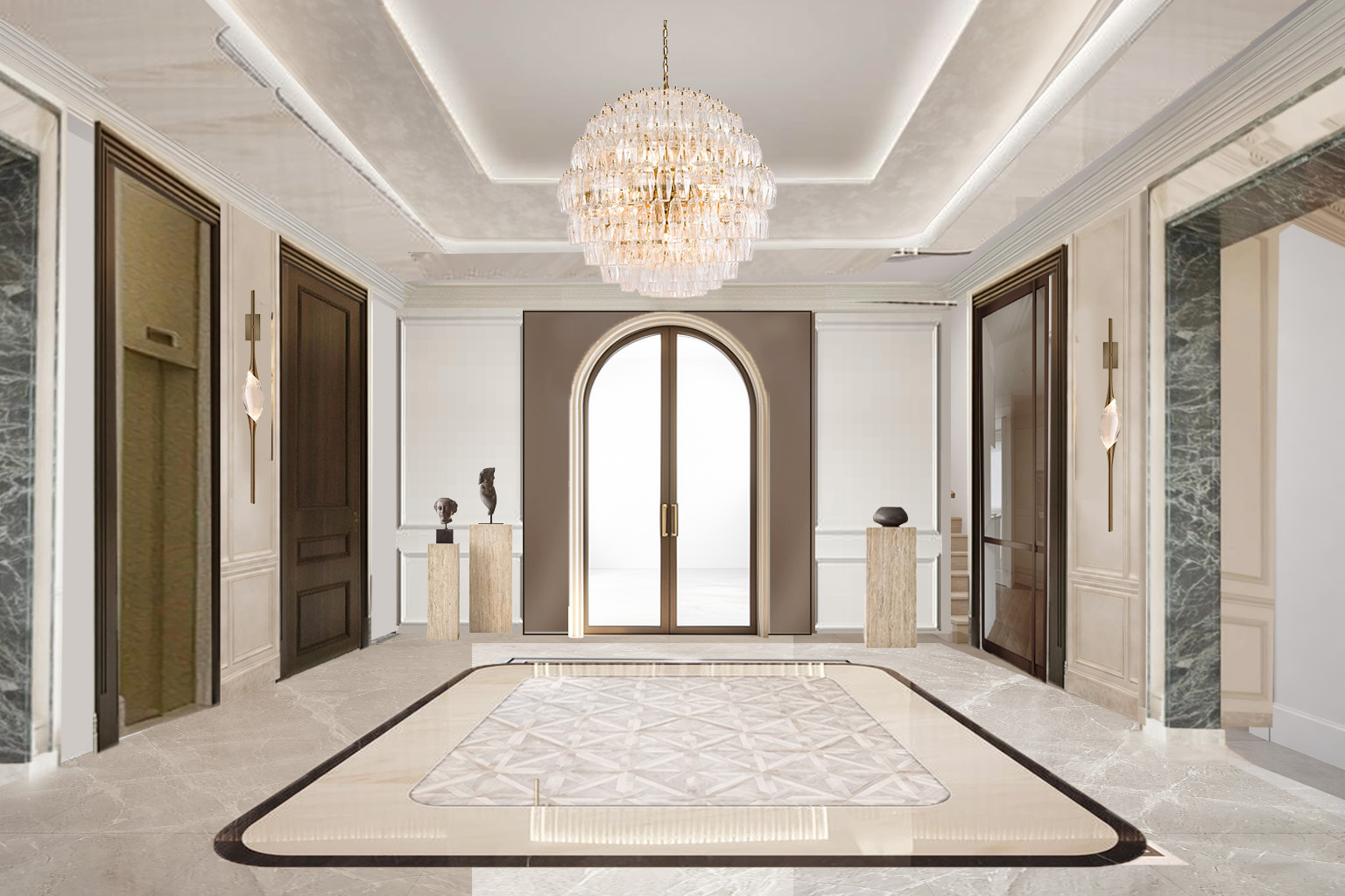 enhance this image for clarity and quality only increase sharpness resolution and lighting balance while preserving the original colours materials finishes and textures the enhance the high gloos finish in the ceiling addin reflexion of the room the arched door has smoked glass around with brown metal trim frame photo to be more musculine styled