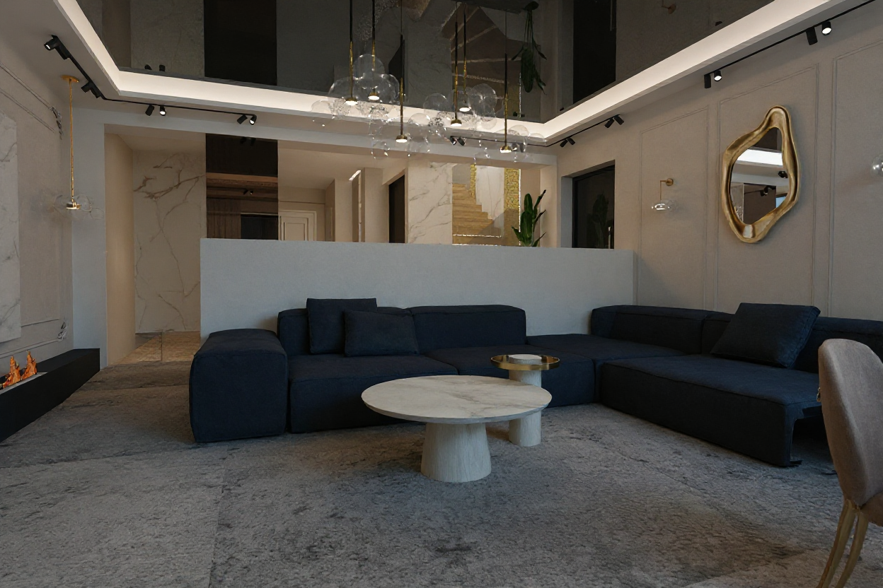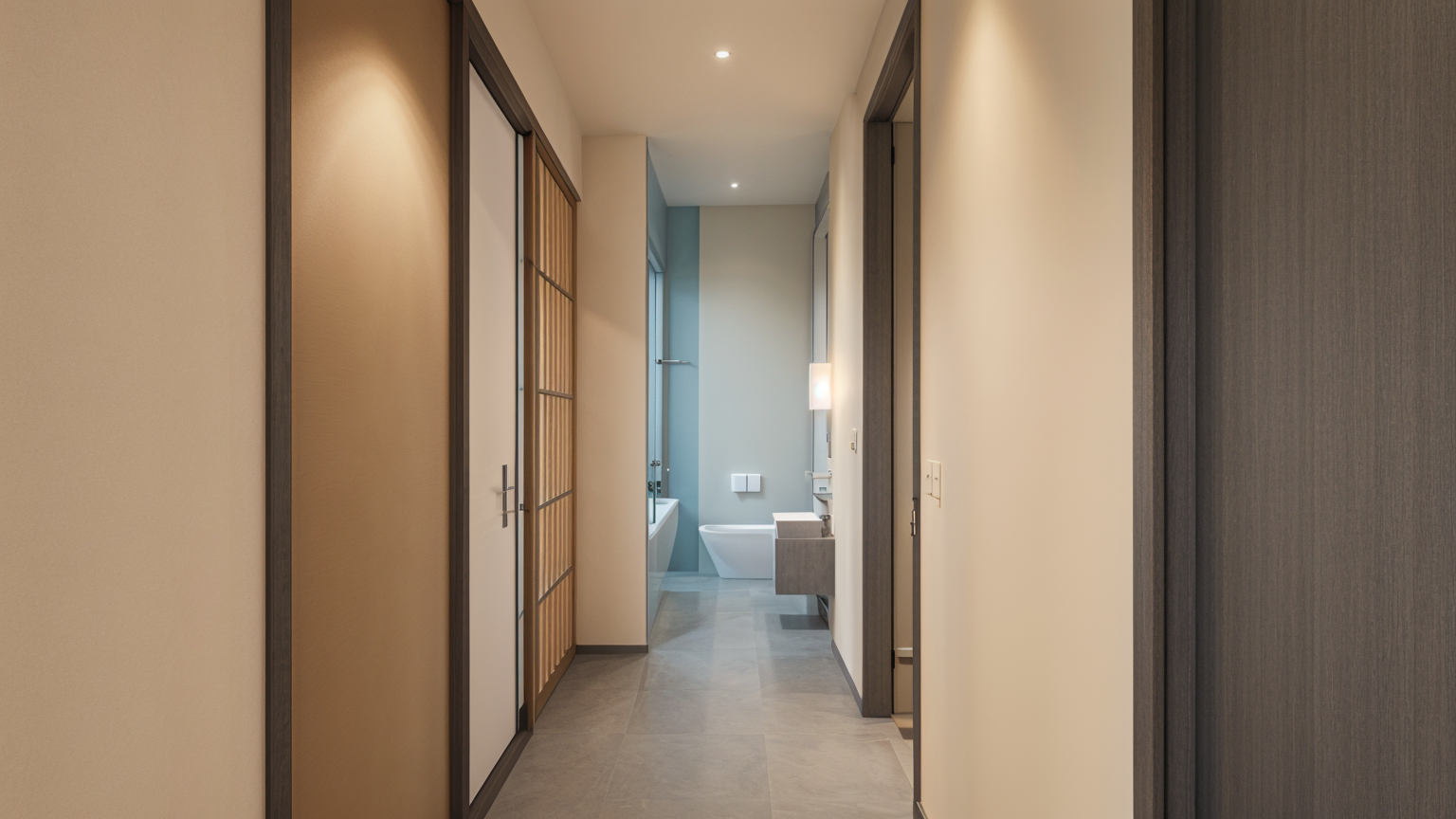 render a modern japanese architectural layout with a serene atmosphere use light gray walls to create a soft neutral background highlight the bathroom area with a pastel blue shade for a refreshing feel apply a warm beige tone to other designated areas for a cozy contrast include dark gray outlines for walls to emphasize structure ensure a clean minimalistic design to evoke a sense of tranquility and openness architecture