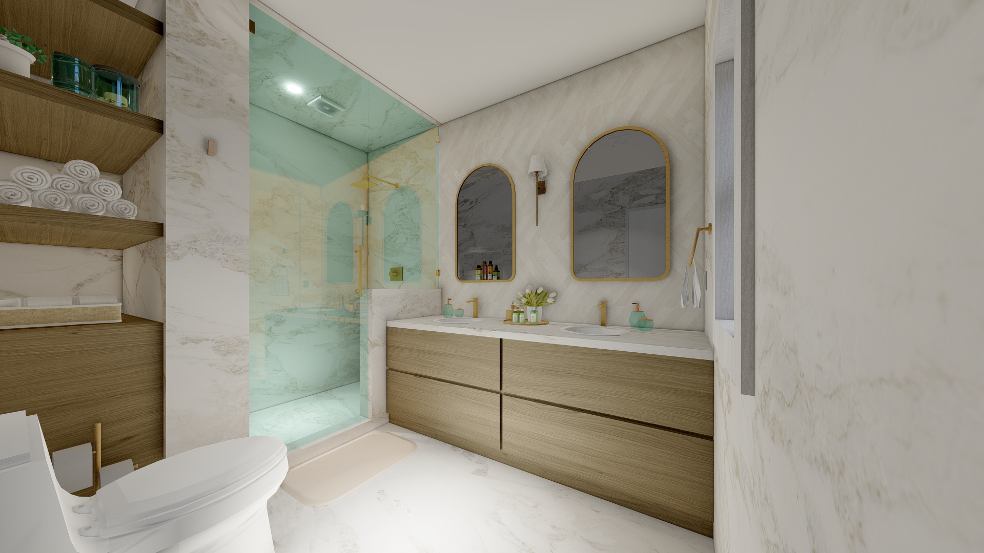 ultra realistic modern bathroom with balanced natural lighting and soft shadows keep the exact same layout and proportions use light natural oak wood for the vanity soft beige undertone smooth matte finish subtle linear grain gentle warm highlights fine vertical wood texture minimal knots uniform coloration with slight organic variation high end scandinavian appearance mirror wall finished with glossy herringbone wall tile elongated rectangular pieces in precise zig zag pattern high gloss ceramic surface reflecting light softly clean grout lines uniform spacing elegant modern look realistic highlights emphasizing depth and geometry all other walls and floor in ceramic marble look tile soft white base with subtle grey veining polished finish natural stone variation refined and contemporary gold fixtures clean reflections accurate material textures crisp details and a warm inviting atmosphere