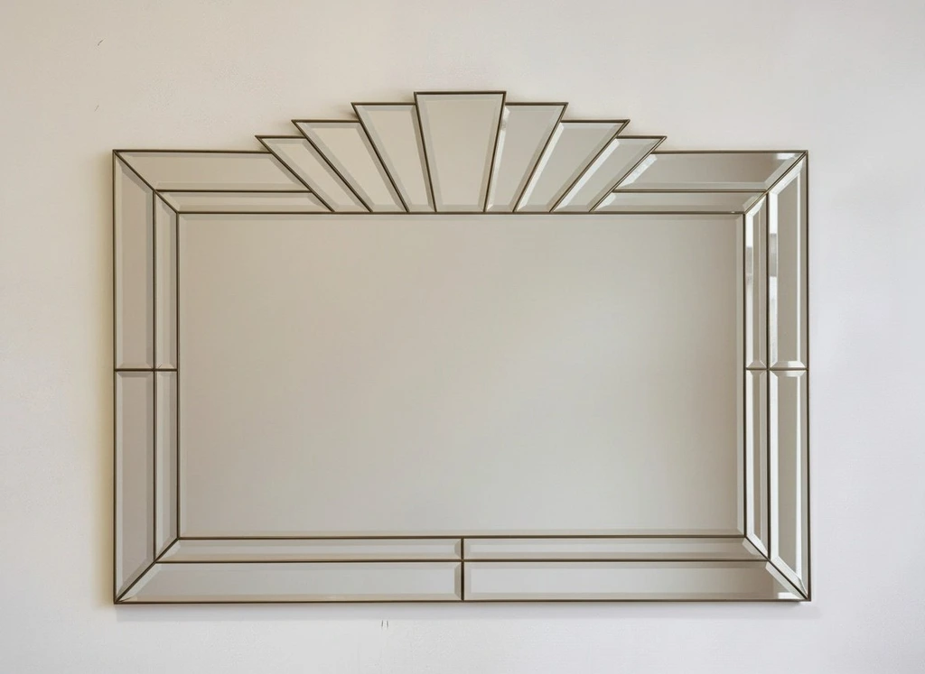 create a beautifully rendered art deco rectangular mirror with a sunburst pattern at the top the frame should exhibit an elegant combination of brushed gold and silver metallic hues giving a luxurious and sophisticated appearance the mirror itself is pristine and reflective capturing soft ambient lighting the atmosphere is serene and contemporary with a subtle soft white background to enhance the mirror s metallic accents and design
