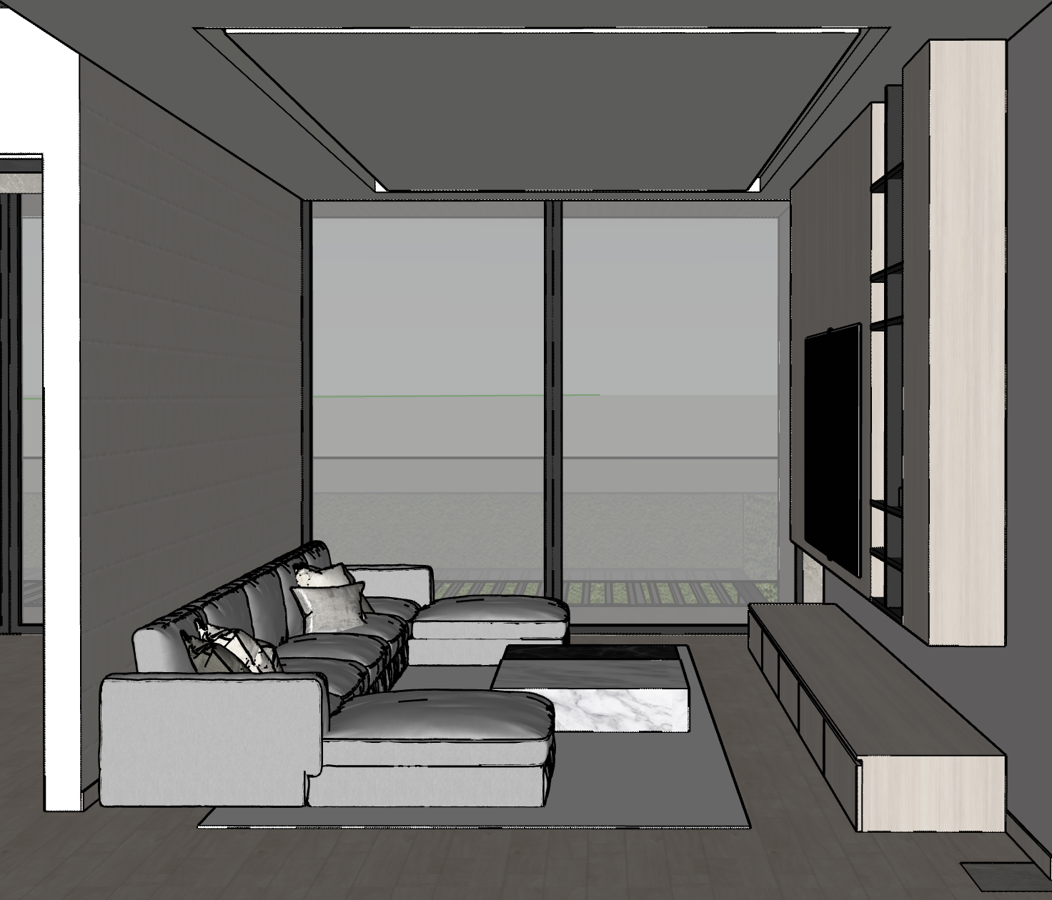 render a modern family room with a large sectional sofa in soft gray fabric accented with neutral decorative pillows in front of the sofa place a low rectangular coffee table with a white marble top and dark base the back wall features full height sliding glass doors with sheer curtains allowing natural light to filter in on the right a built in media wall in warm wood tones and matte gray panels houses a large flat tv with open shelving floors are dark natural wood with a neutral rug under the seating area use neutral cool daylight with soft shadows and subtle reflections creating a calm and sophisticated ambiance