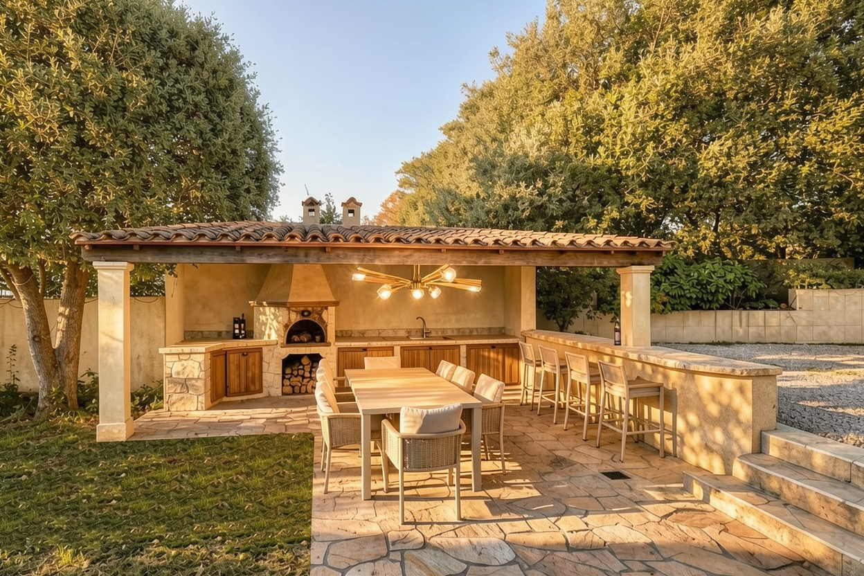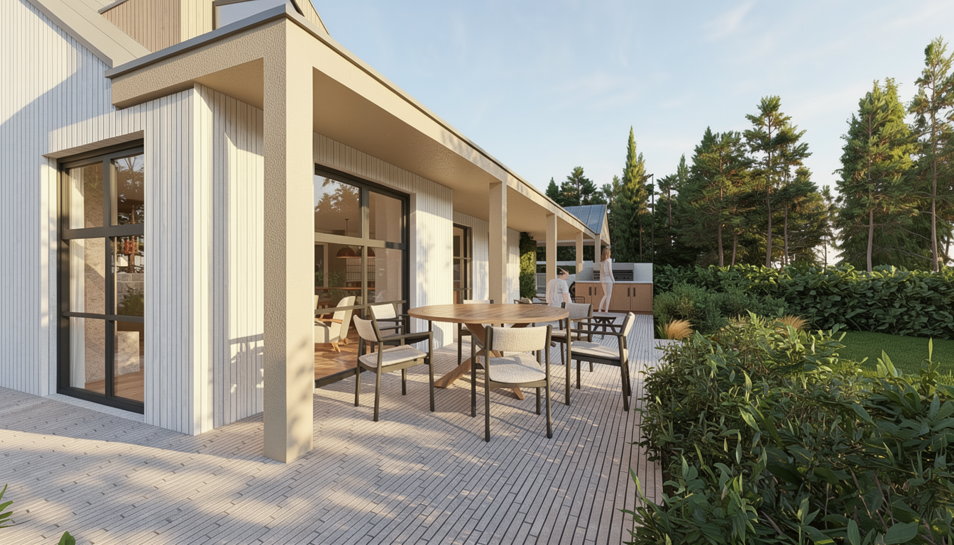 make this pergola wooden with 10 spaced slats and make it a night image with floor lighting take away the lighting on top of the pergola