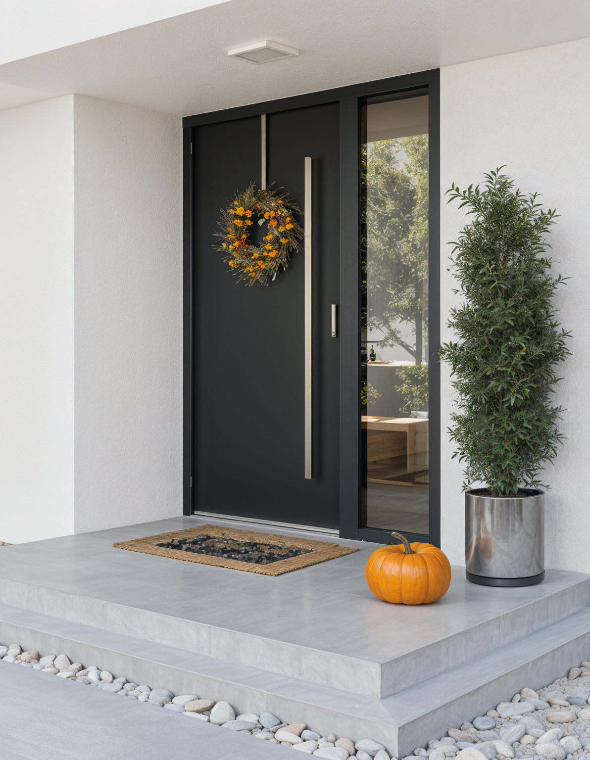 create a serene bathroom with soft nuetral floor and wall tiles the shower has rich eculptus green rectangular features tiles to the walls place floating blackened oak vanity with curved corners and a large flat cylinder shaped feature handle in a wooden finish split in half between the two doors the vanity counter is a clean white thin quartz with a single undermounted sink place a slim mirrored cupboard above with ambient lighting and vertical towel rails to the right of the vanity
