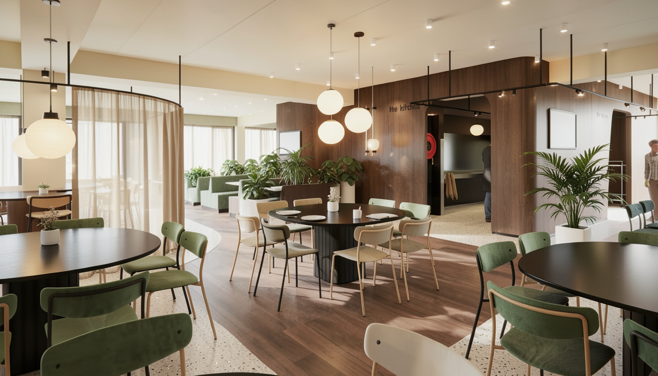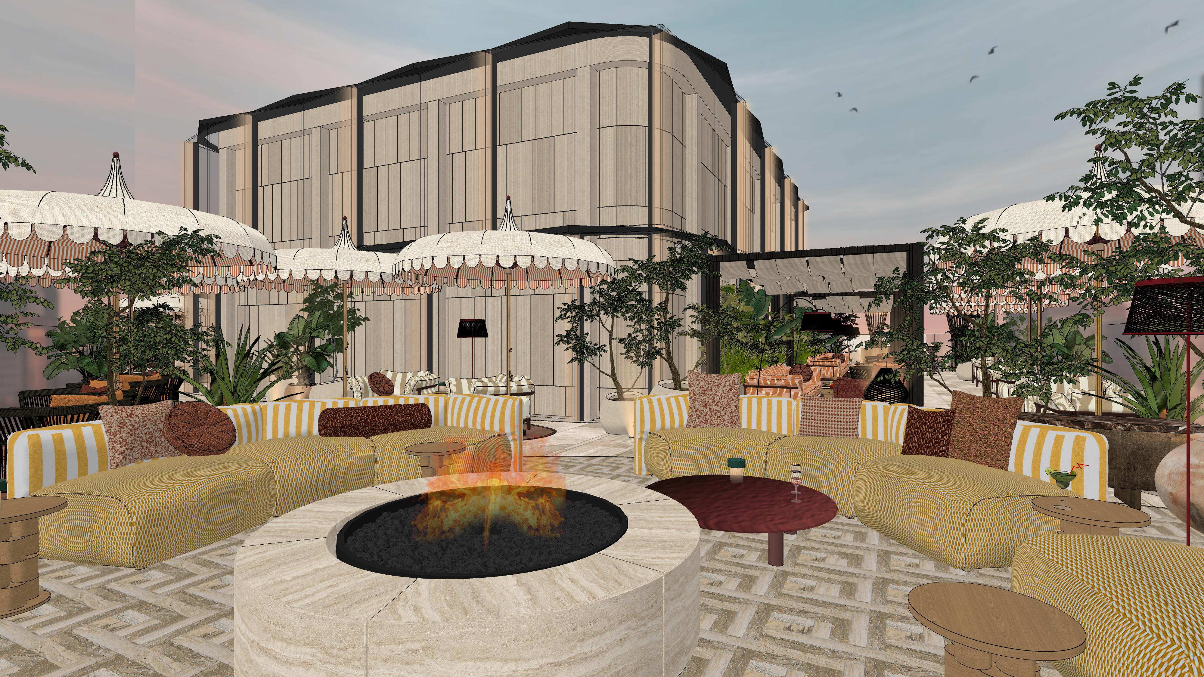 please create a realistic photo from this view do not change the materials on the walls and add lighting to the bar