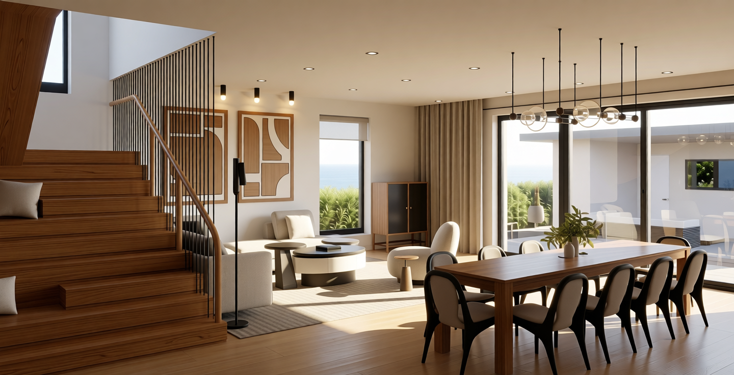 add slim tanned woman walking on the veranda in a flowing black silk dress add a strong motion blur to her the lower roof is 2 4 meters tall and the woman should be 1 6 meters tall add a very light fog