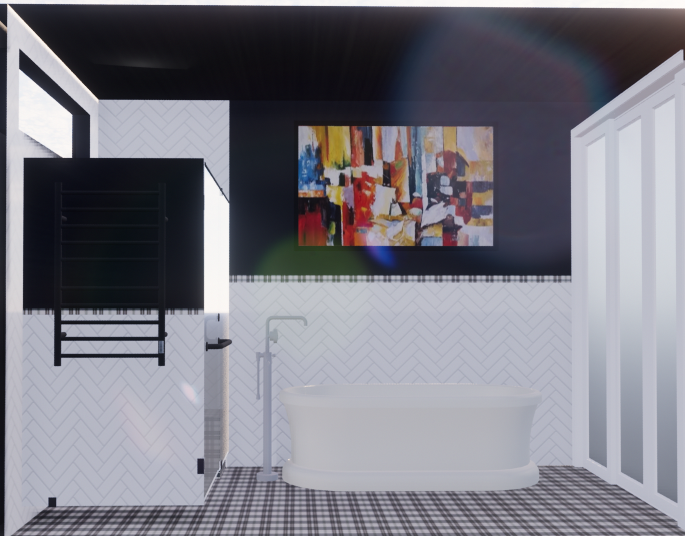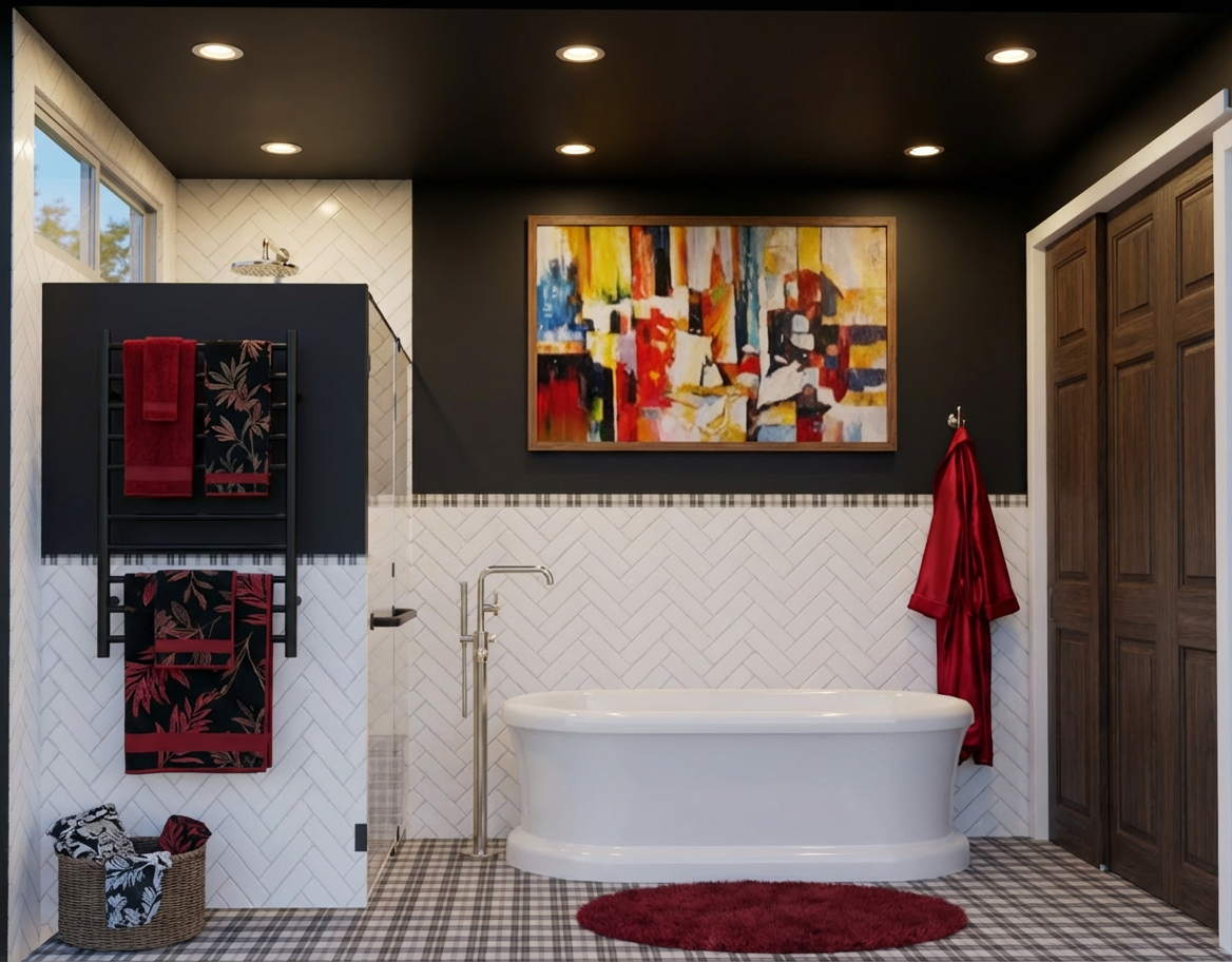 make this rendering into a real photo preserve the material colors patterns scale and dimensions add a small oval fluffy dark red rug in front of the tub add a towel hook in polished nickel to the wall perpendicular to the towel bar and hang a red silk robe on it some of it can be cut off make the tub filler in a polished nickel finish the sliding doors should be a in a dark grain wood with raised panel door front add 2 recessed cans where the lights are add one more recessed can in the same size as the others above the shower add some trees and blue sky outside the window and include a sliding window in the window cutout with a black frame add some red and black towels in a japanese botanical pattern to the towel bar on both the top and bottom and have a circular woven basket under it and put some used towels in them also that have a patten in purple and yellow make the art piece surrounded by a wooden frame add an upscale wooden holder to the tub with a bath sponge and soap on it