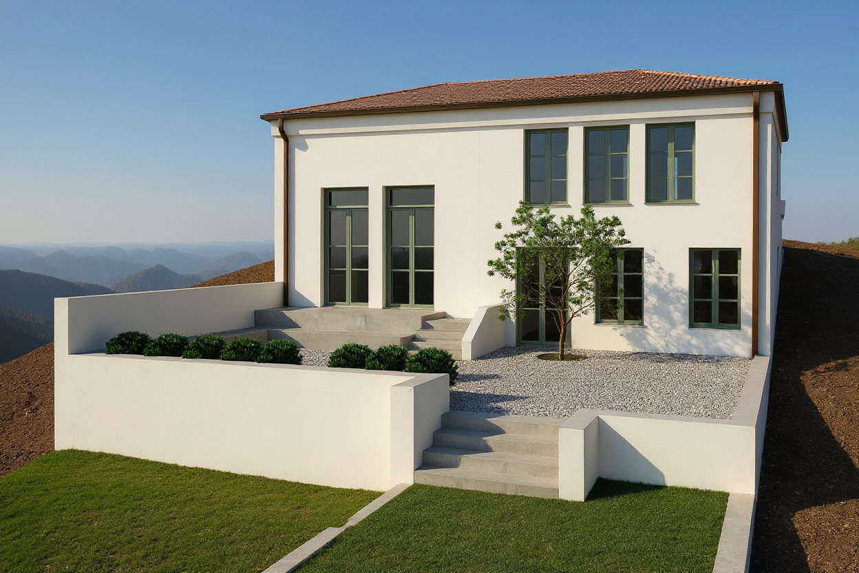 exterior shot ultra photorealistic cinematic rendering of a french contemporary two story home with light cream stucco walls black steel windows and arched french doors midday natural sunlight from the front with soft directional shadows and realistic reflections on glass set in an elegant luxury suburban neighborhood with manicured landscaping lush green lawn trimmed hedges and a straight concrete walkway leading to the front door high end architectural photography aesthetic shallow depth of field subtle lens bloom physically based pbr materials realistic stucco texture detailed roof shingles 8k ultra quality shot on leica full frame camera with 35mm lens editorial lighting balance color graded for warmth and depth architecture