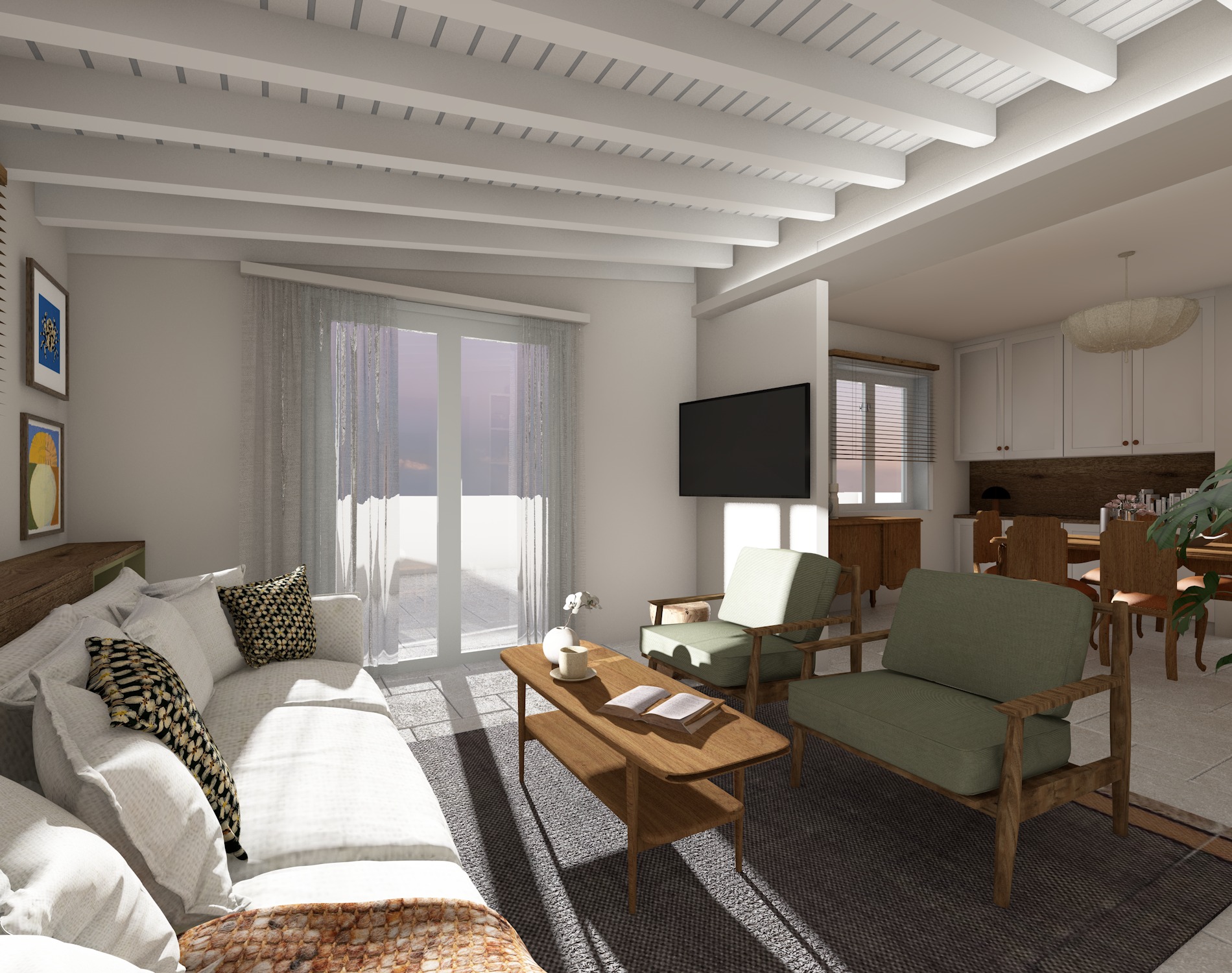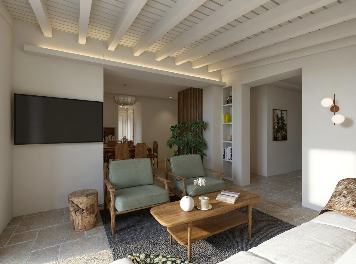 realistic daylight cozy house with realistic textures the roof is off white with lighting on the celling the celling bright there is light on the false celling bright the outside view are apartments