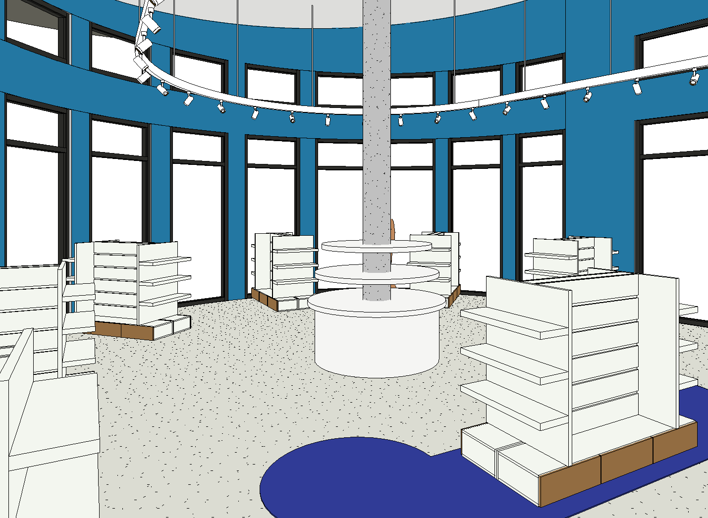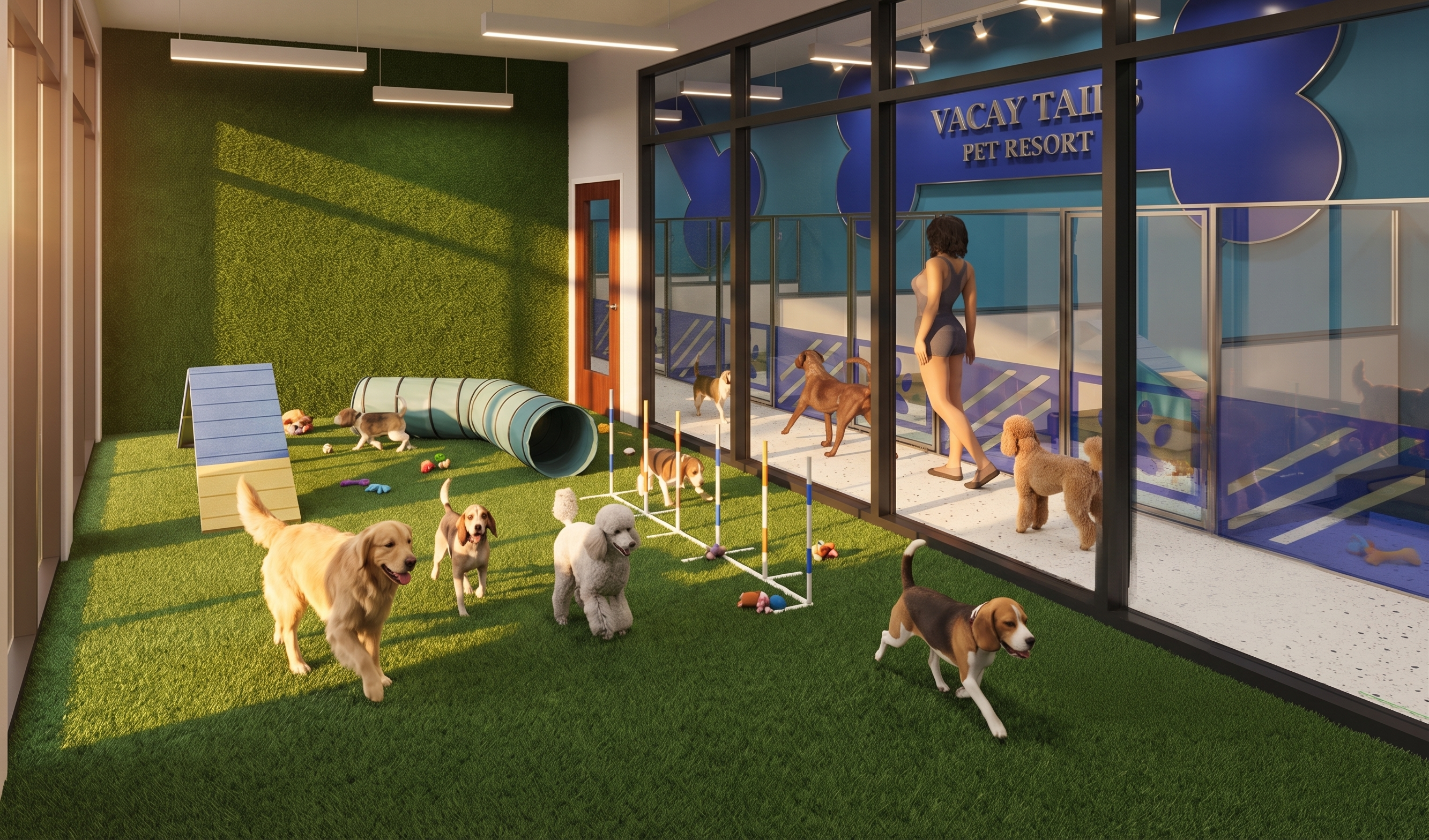render this make the floor and white speckle vinyl add dog merchandise onto the shelves a few people shopping with their dog make the background west coast pine forest from a second level view