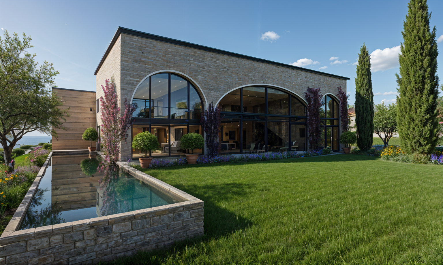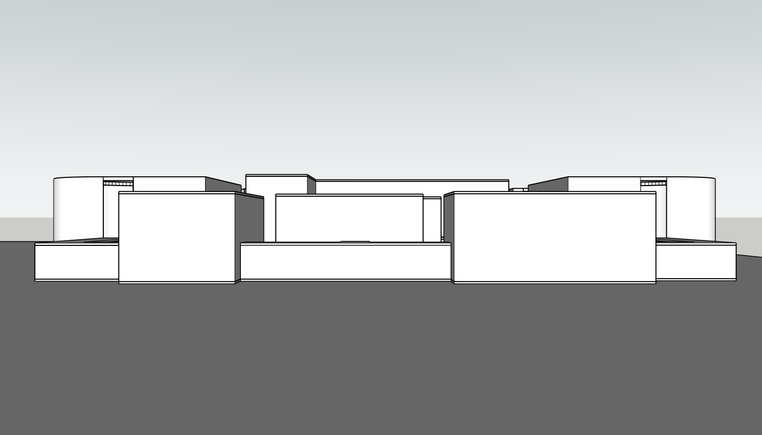 futuristic art gallery inspired by formula 1 design on a tropical island surrounded by palm trees perforated metal facades reflective steel surfaces glowing lights at dusk ultra modern architecture miami skyline in the distance