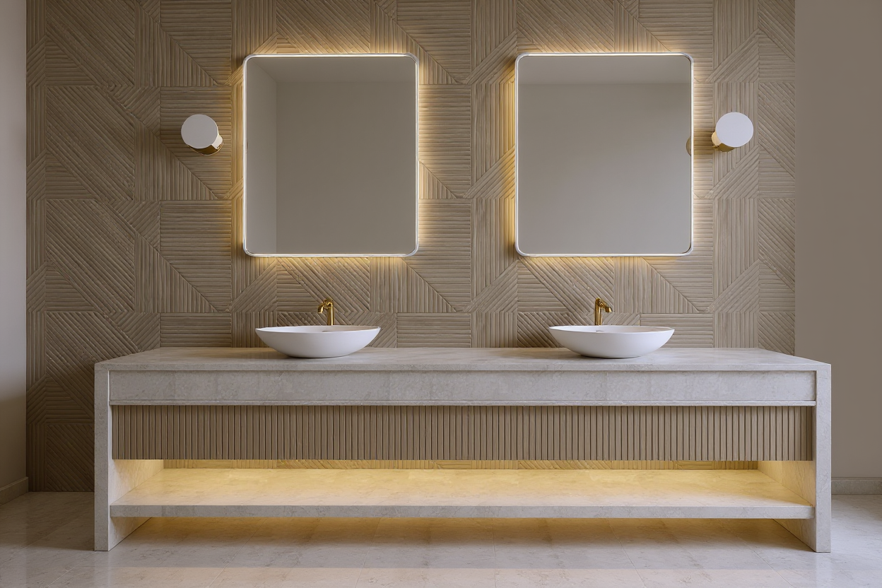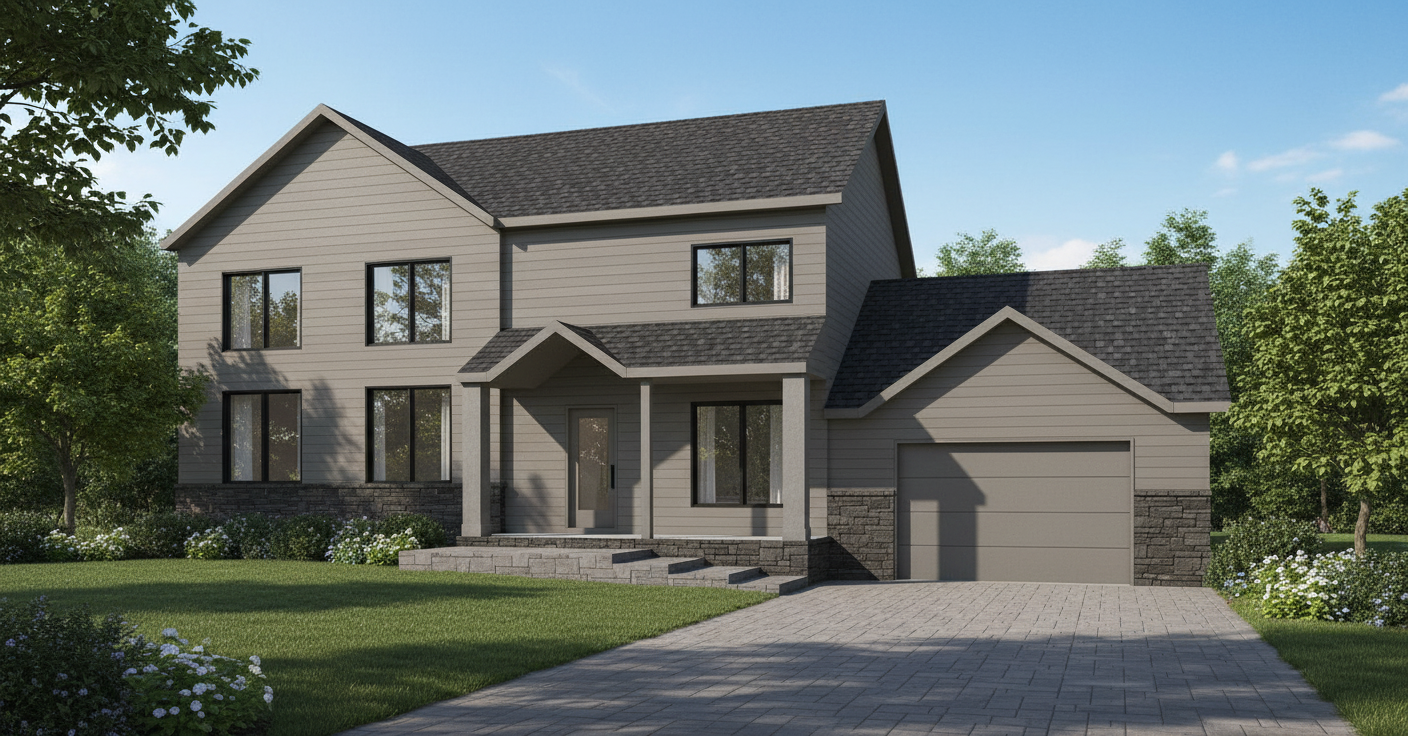 grainy watercolor render of timber frame building with reclaimed wood siding and stone wainscot watercolor trees and urban environment in the background extensive watercolor landscaping surrounding the building parking lot in the background architecture
