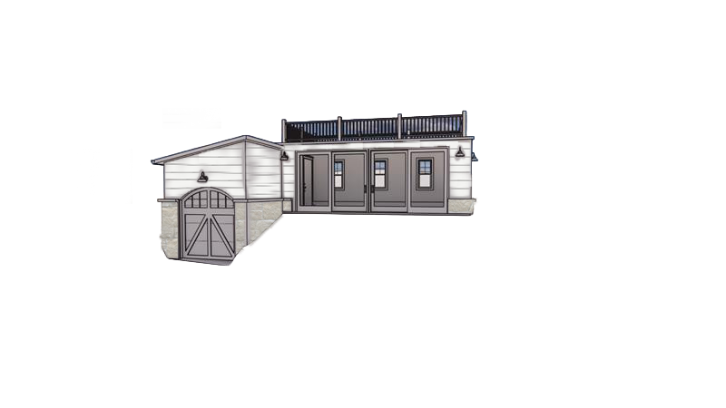 create realistic rendering of this structure garage door window trim and railing should be dark green color do not change size or scale