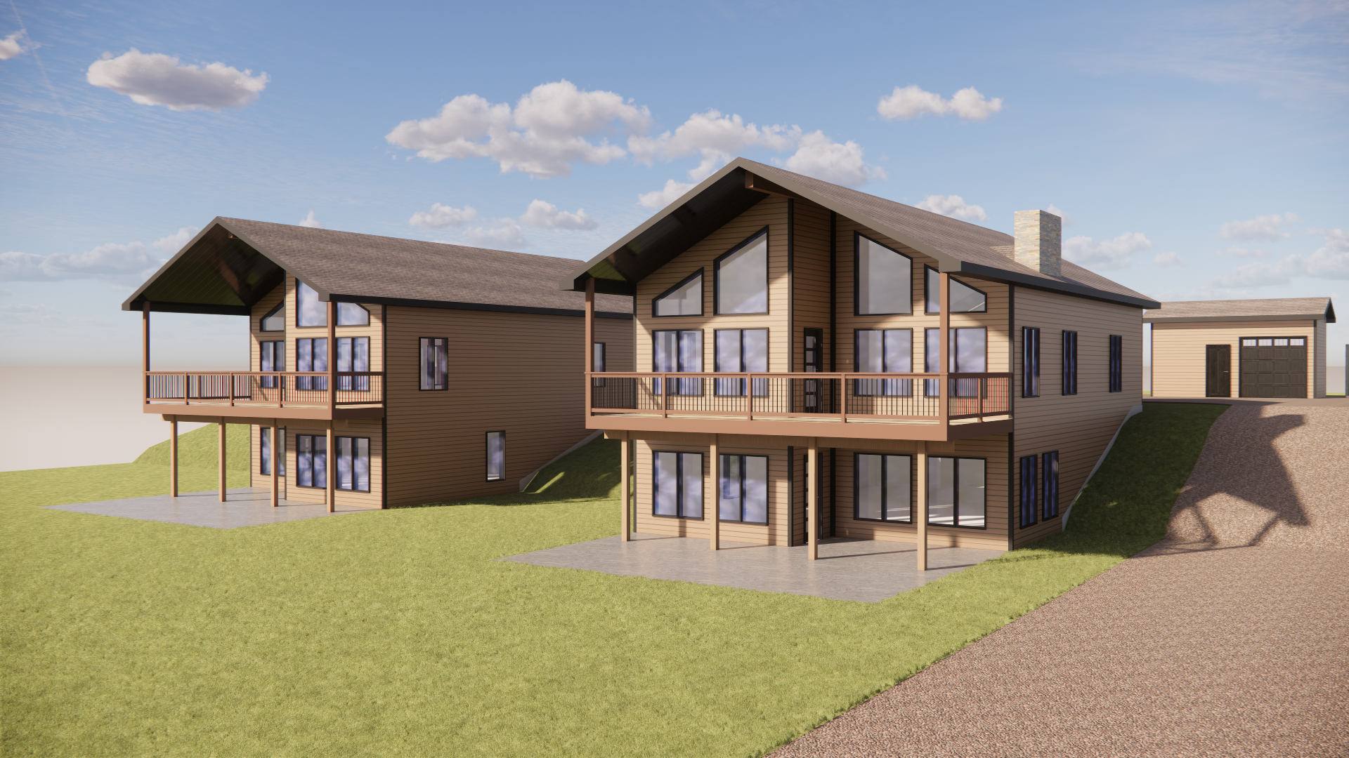 matching vacation rental houses keep the windows doors deck everything the same as it shows don t change anything about the buildings dark brown architectural shingle roofing black trim around the roof windows and doors stone chimney cedar colored 5 horizontal vinyl siding built into a hill with a gravel driveway green grass lawn with a stamped concrete patio with a firepit and chairs below surrounded by trees in the middle of a woods and bright sunny day