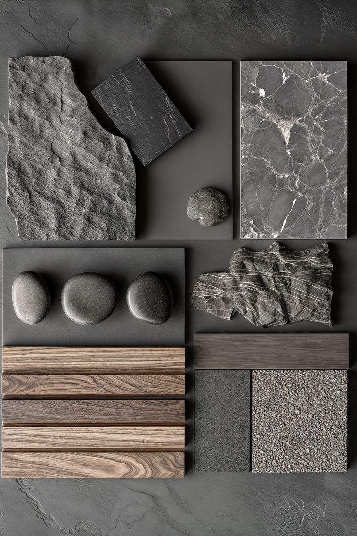 interior shot render a modern bathroom with a textured farmhouse design feature a rustic wood vanity with a gray stone countertop above it place a large black frame mirror flanked by a stylish matte black light fixture the walls are a warm white creating a clean bright atmosphere install matte black fixtures including a contemporary faucet and towel hanger the ceiling has a warm wood finish adding coziness the floor is composed of textured charcoal tiles enhancing the room s rustic vibe add subtle ambient lighting for a soothing and sophisticated atmosphere