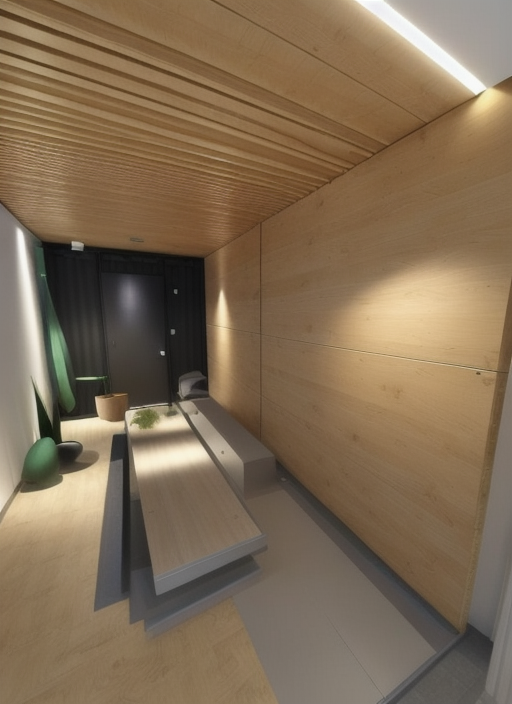 exterior shot zen japandi office lobby interior inside an industrial container size 4 1 x 2 3 meters ceiling height 2 3 meters calm but functional workspace with a serene spa like atmosphere light beech wood slatted floor continuing onto the back wall narrow vertical slats matte natural finish side walls finished in warm sand or clay toned microcement soft handcrafted texture no grey tones ceiling with a delicate beech wood grid and white natural jute panels softly backlit with hidden warm led lighting 2700k stopsol bronze tinted glass entrance framed in light beech wood minimalist beech wood desk with an ergonomic fabric office chair in beige tones integrated coffee corner with a built in beech wood cabinet minimalist espresso machine ceramic cups in earthy tones natural linen rug subtle textiles living plants including a bonsai or small indoor tree hotel lobby meets modern office japandi zen style earthy natural spa mood soft indirect lighting peaceful yet productive atmosphere high end architectural visualization ultra realistic cinematic lighting