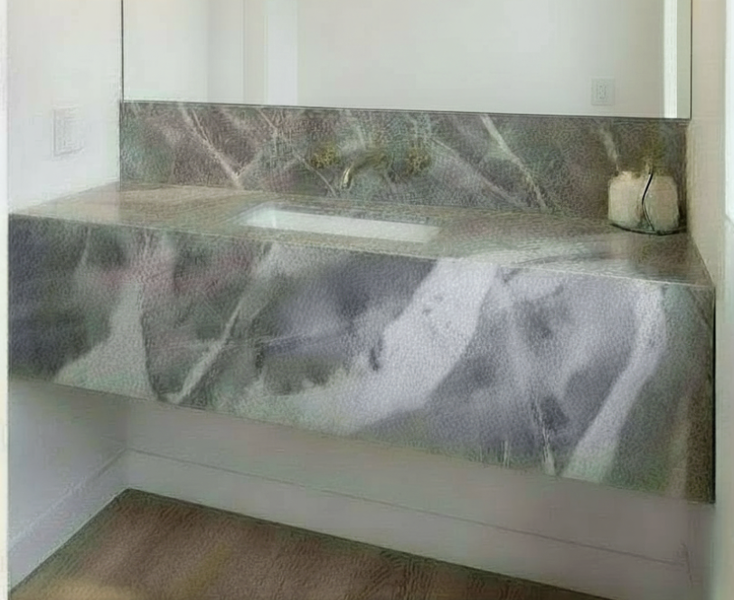 interior shot small powder bathroom vanity floating marble sink in wall sink faucet tall matching backsplash vanity wall mirror pendant hung on left of sink