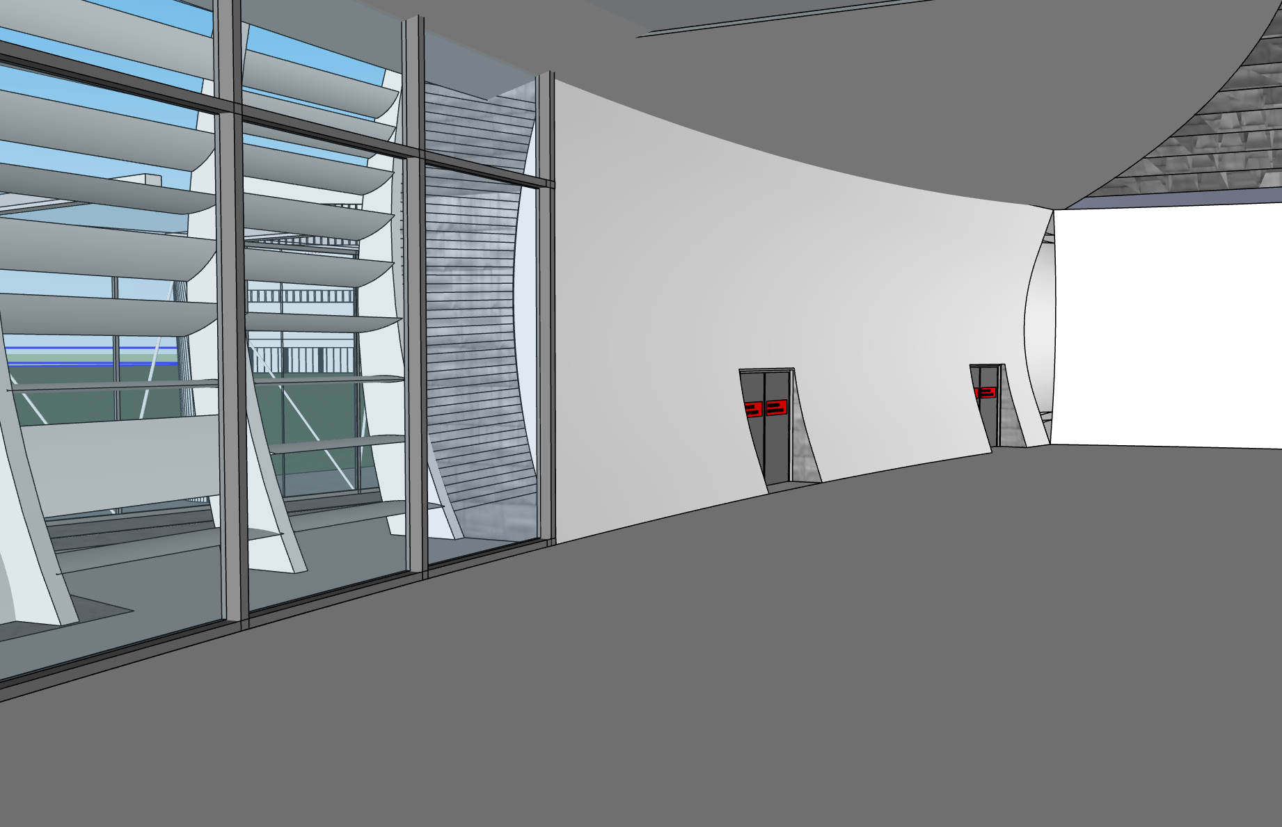 modern exterior shot interior shot round gallery building soft warm sunlight in steel glass lamel facade architecture details visible from inside architecture