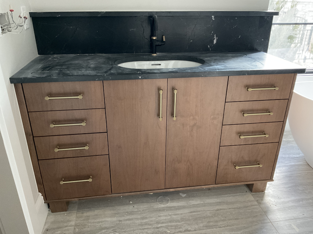 do not change the cabinets in any way preserve the exact cabinet colors materials finishes dimensions door and drawer styles hardware spacing alignment and all geometry exactly as shown do not alter the countertop shape backsplash appliances flooring lighting fixtures or wall structure only remove the construction materials clutter and mess from the scene clean the room and make it look finished and staged add a few simple tasteful home accessories appropriate for the style of the space but do not add or remove any furniture windows or architectural elements maintain the original lighting direction and realism enhance clarity and polish the photo while keeping the cabinetry and room design completely unchanged do not alter the lighting to keep the cabinet colors as they are in the image stage for a luxurious modern bathroom