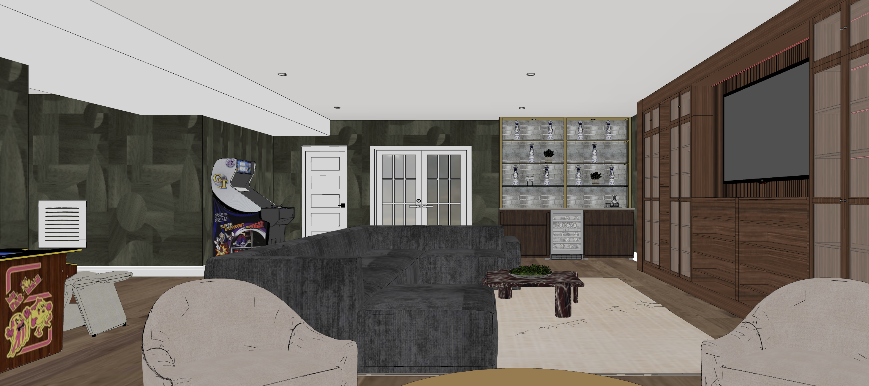 generate a realistic rendering of this space do not change the textures furniture or anything else just enhance it and make it more realistic add led lighting inside the bookcases and above the tv this is a room in the basement shelves below the tv