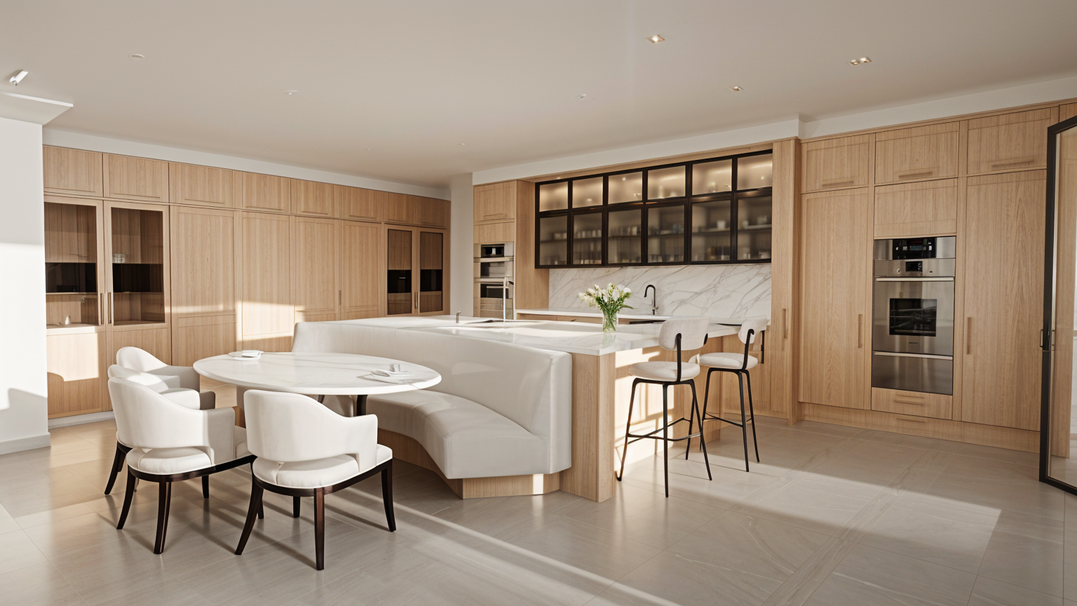 modern luxurious and premium kitchen with mid tone oak with consistent grain cabinetry sleek marble countertops and a minimalist design add soft natural lighting to create a welcoming atmosphere the chairs feature dark wood adding contrast include a high end stainless steel oven and a subtle neutral floor that complements the cabinetry the overall color palette is warm with beige and cream tones accented by the stainless steel appliances the atmosphere is elegant and contemporary emphasizing clean lines and a spacious layout add a white decorative room coving above all furniture