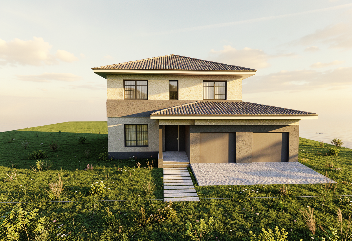 change the color of this house to greige with black shutters change the roof color to black add a large front porch with gable roof add a white garage door fascia and soffit to be black