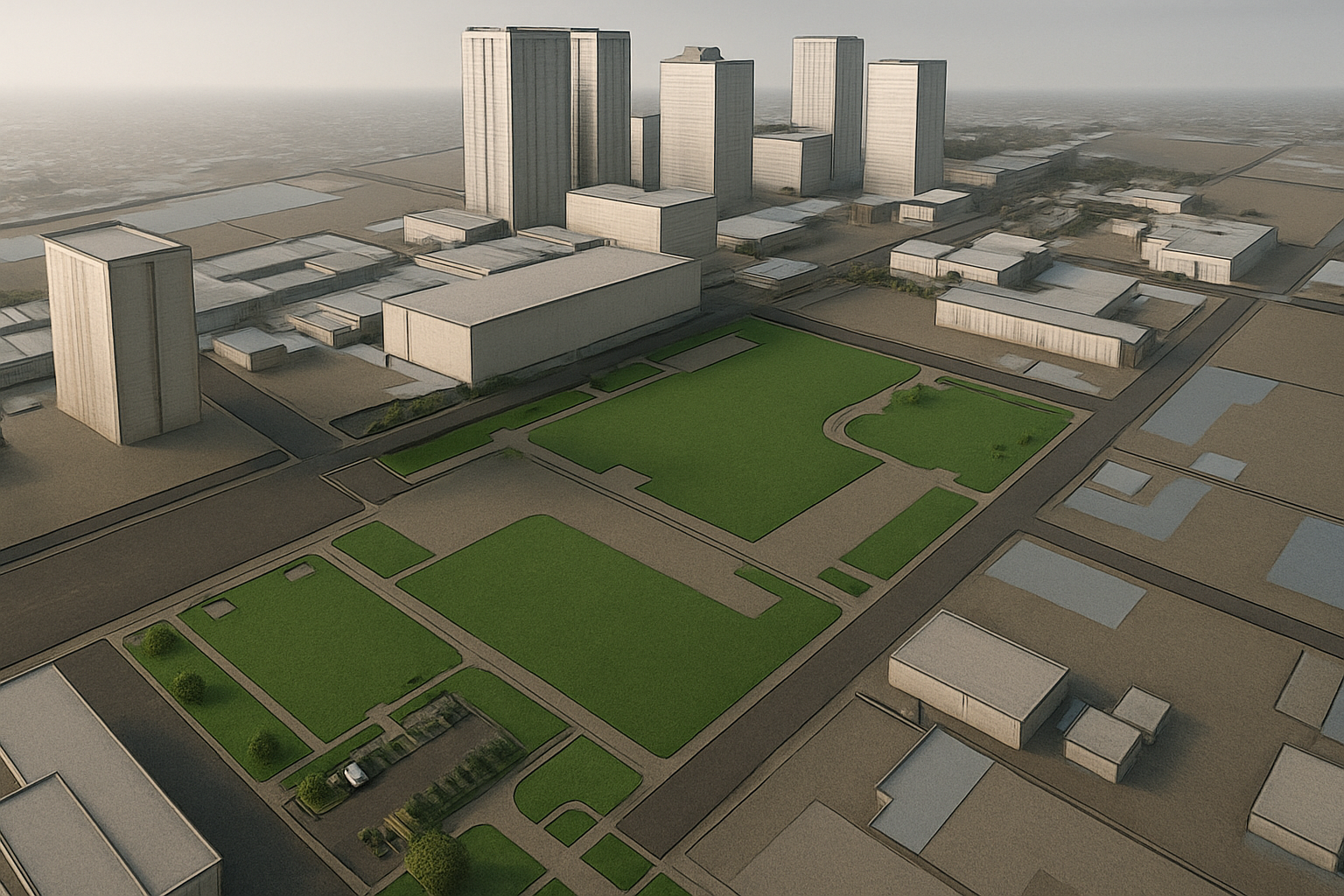 create an isometric urban massing model of a city block use only clean white or off white surfaces with soft shadows include simplified rectangular building volumes of varying heights arranged in clusters similar to a masterplan add roads as flat dark gray planes and large open green areas as flat planes without texture no zoning colors no labels no textures the entire scene should look like a minimal architectural massing model ready for rendering with smooth lighting and neutral background